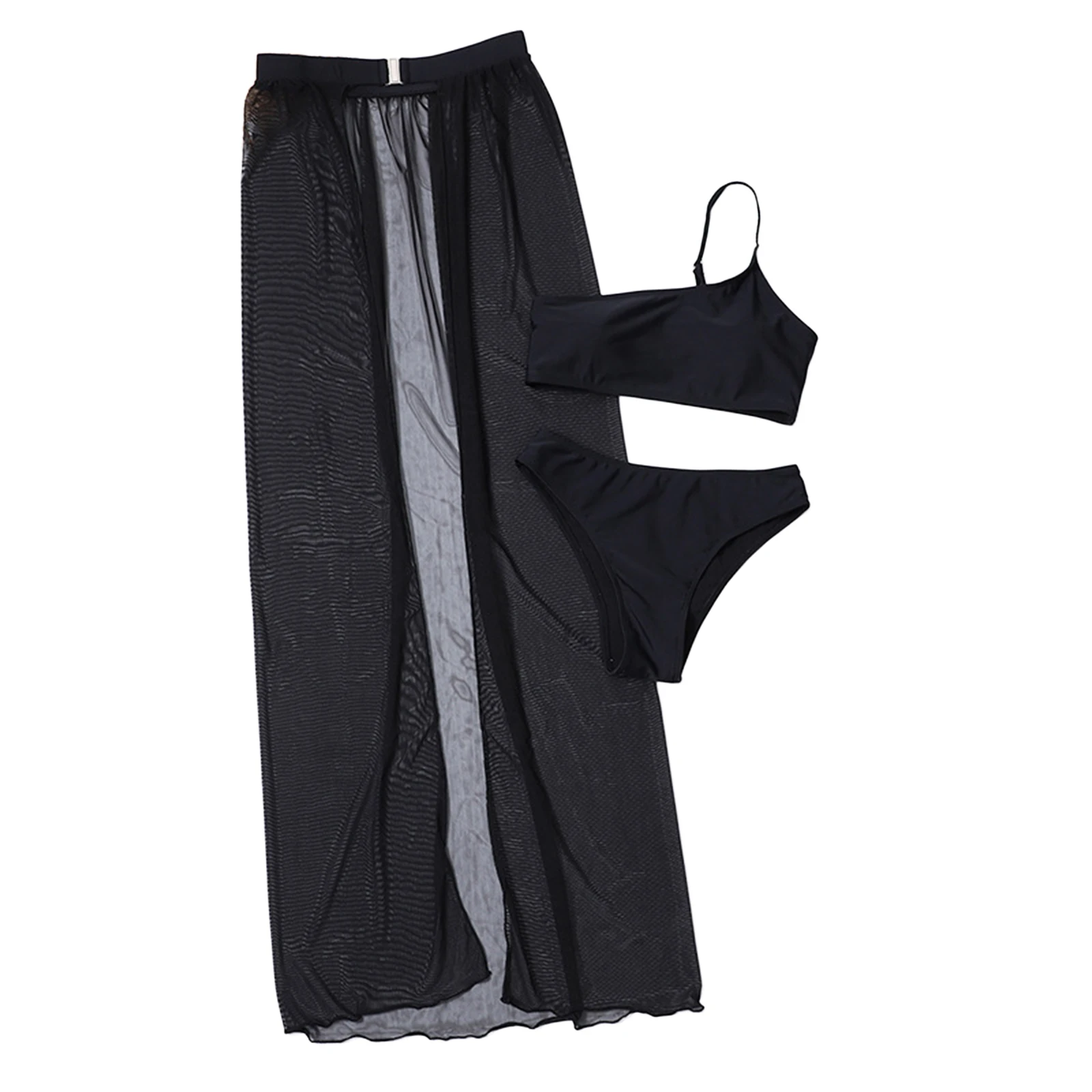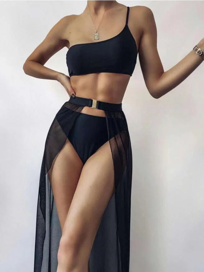 Женский комплект бикини, пикантный черный купальник из трех предметов, на одно плечо, бюстгальтер, нижняя часть, накидка на юбка саронг, пляжная одежда