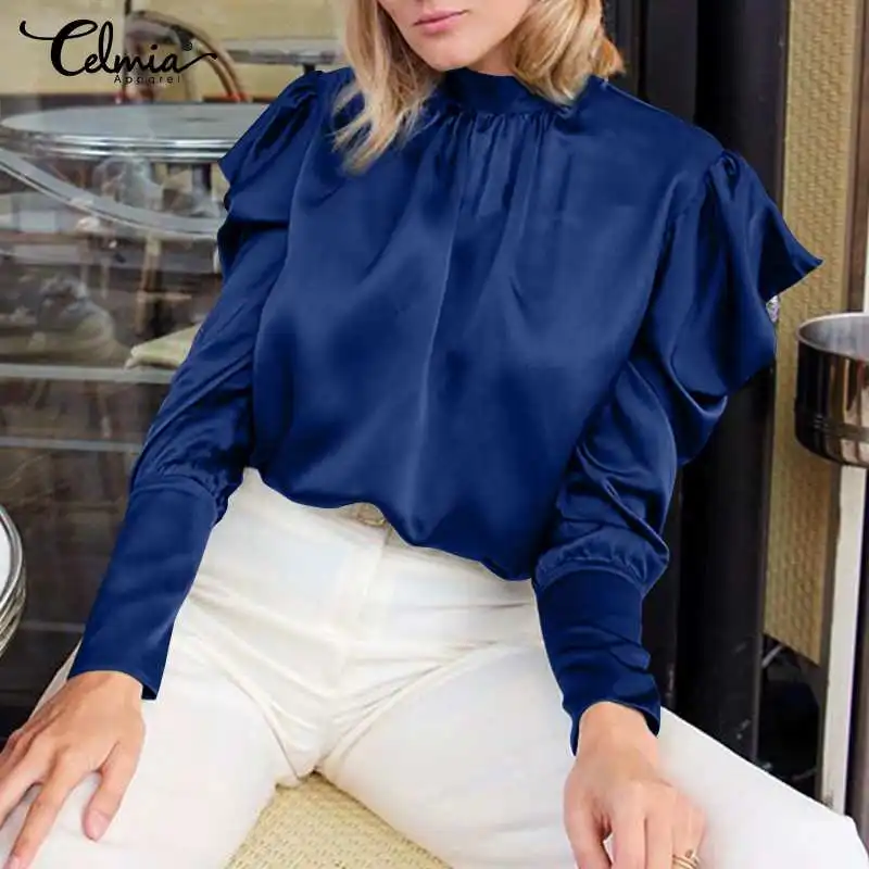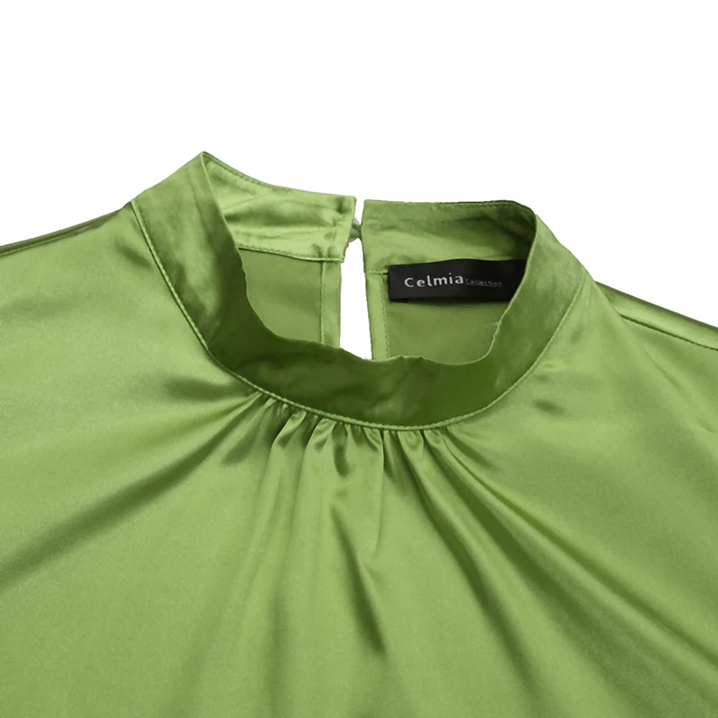 5XL Celmia женские атласные блузки с модным воротником-стойкой однотонные рубашки для мальчиков с короткими рукавами, шифоновая блузка с короткими рукавами офисные плиссированные женские блузки, плюс размер, гладкие атласные T