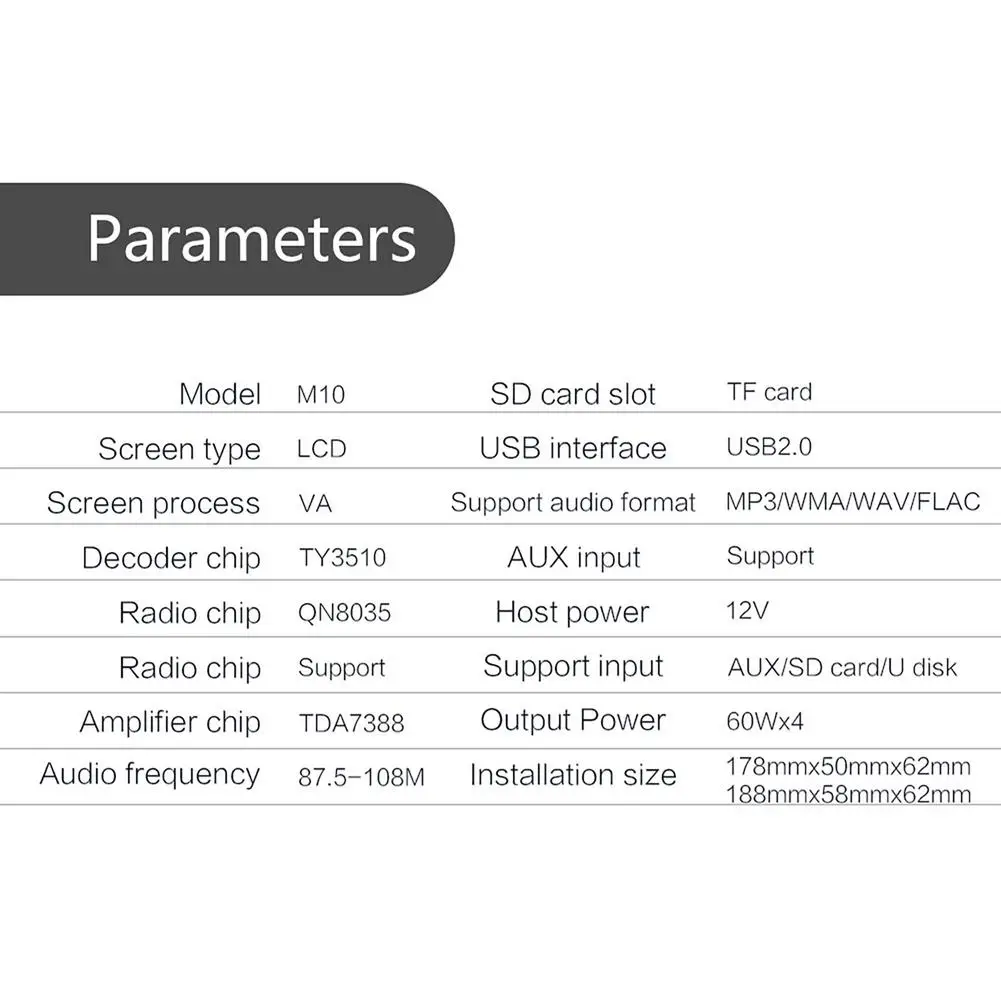 Особенности:1. Функции Bluetooth и AUX2. Цифровое высококачественное fm-стерео радио (fm87,5 ~ 108 МГц)3. Поддержка чтения карт и U диска (аудио)4. Поддержка аудио: MP3 / WMA / WAV / FLAC5. Дизайн сенсорного экрана6. Аудиовыход RCA может быть подключен к сабвуферу7. Поддержка дистанционного управленияХарактеристики:Тип: автомобильный стерео MP3-плеерСпециальная функция: fm-радио, Bluetooth, беспроводные звонки, mp3-плеер, AUX, Двойная зарядка через USB, полноразмерный сенсорный экранМодель: M10Напряжение: 12 ВОС: нетПрограммное решение: SC3510Чип усилителя: TDA7388Тип экрана: полноразмерный сенсорный ЖК-экранРазмер панели: около 188*58 мм/7,40*2,28"Панельный светильник: Красочный переменный светильникРазмер цветной коробки: около 220*82*181 мм/8,66*3,23*7,13"Глубина хоста: около 60 мм/2,36 дюймаВес одной машины: около 400 гРадио диапазон: FMРадиочип: Интеграция чиповМощность: 4*60 ВтSNR (дБ): ≥ 60 дБСтепень искажений (%): ≤ 0.3%Чувствительность: менее 20 дБСтерео разделение: более 25 дБРабочая температура: -10 ~ 60 ° CМодель Bluetooth: AUTOTOBTВерсия Bluetooth: 4,0Радиочастота: 87,5 ~ 108 МГцСлот для tf-карты: ДаПульт дистанционного управления: ПоддержкаИнтерфейс USB и версия: USB2.0Кнопка: Физическая кнопкаRca-клеммное введение: 4-канальный аудио выходAUX аудио вход: ДаФункция подключения сотового телефона: не поддерживаетсяПоддерживаемые Аудиоформаты: MP3 / WMA / WAV / FLACУпаковочный лист:1xMP3 плеер1 х шнур питания1 пульт дистанционного управления2xDisassembly ключ1 ИнструкцияПримечания:1. Этот плеер 12 В, который не соответствует напряжению 24 В2. Возможны незначительные отклонения в размерах вследствие измерений вручную, различных методов измерения и приборов.