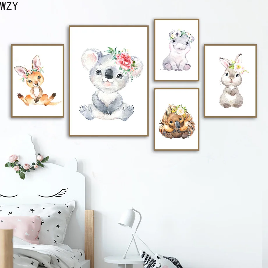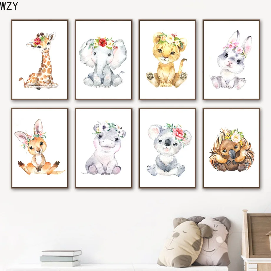 Лев, слон, жираф, коала, кролик, цветок, корона, настенная живопись, скандинавский Декор детской комнаты, плакаты и принты, настенные картины