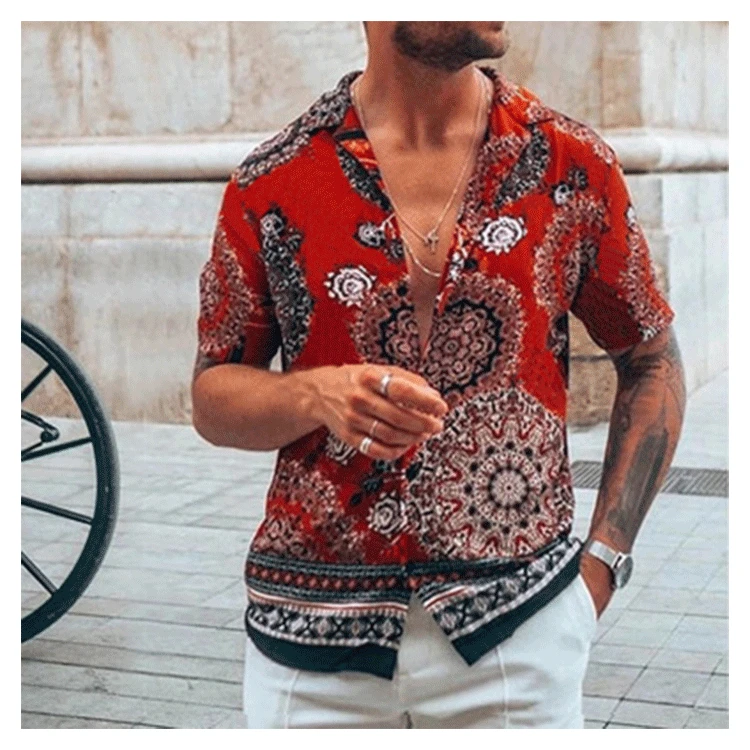 Мужская летняя рубашка, с этническим принтом, с воротником-стойкой,...