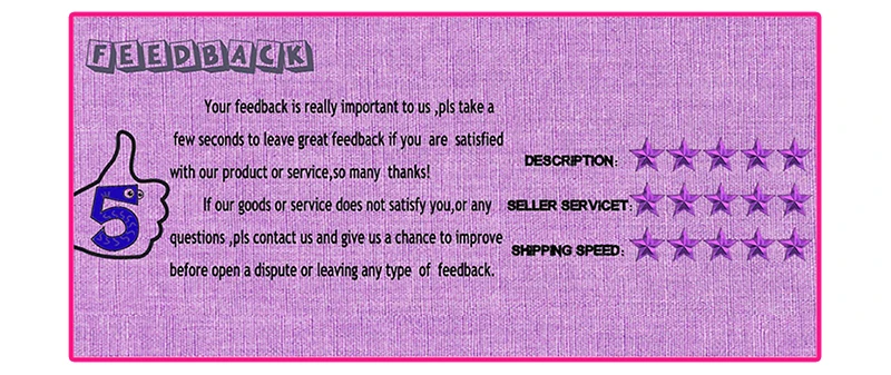 Ваше удовлетворение и положительные отзывы очень важны для нас. Пожалуйста, оставьте положительные отзывы и 5 звезд. Если вы удовлетворены нашими товарами и услугами. Пожалуйста, не оставляйте нам 1,2,3,4 звезд, потому что они равны отрицательным отзывы. Если вы остались недовольны качеством товара и обслуживания, не торопитесь подтверждать получение товара и писать негативный отзыв. Сначала свяжитесь с нами. Мы сделаем все возможное, чтобы решить любые проблемы и предоставить Вам лучшее обслуживание клиентов.