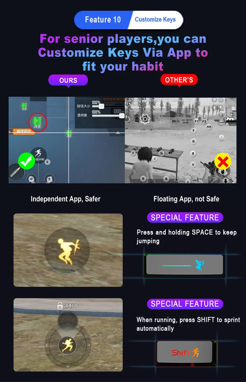 Это многофункциональный конвертер игровой клавиатуры и мыши. Воспроизведение и воспроизведение, соединение Bluetooth 5,0, Поддержка IOS (не поддерживает IOS13.4 и выше) Android Подходит для Мобильный телефон игроков, не изменяйте официальные данные, не будет запрещено Без задержки, без коробки Зарядка во время игры PUBG Поддержка настраиваемых настроек