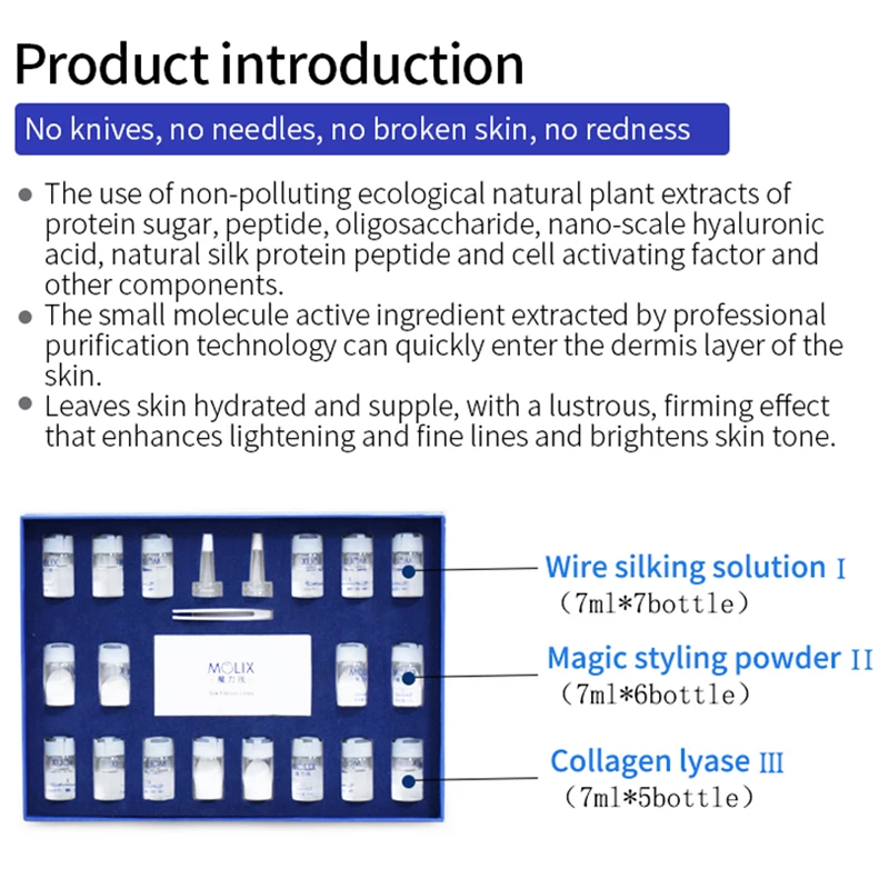 Без ножей, без игл, без повреждений кожи, без покраснений 1. Используется экологически чистые натуральные растительные экстракты белкового сахара, Пептида, олигосахарида, наномасштабной гиалуроновой кислоты, натурального пептида белка шелка и компонентов активационного фактора клеток и других компонентов. 2. Активный ингредиент мелких молекул, извлеченный профессионалом. Технология очистки может быстро попасть в слой дермы кожи. 3. Делает кожу увлажненной и упругой, с блестящим, укрепляющим эффектом, улучшает Осветление и тонкие линии, осветляет тон кожи.