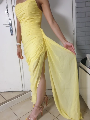 الفستان جميل، بس مو مشابه للصورة، من الخلف مافيه كسرات زي من الامام، وفتحة الساق مرا طويلة وشوي اوڤر اضطريت اني اعدلها بس عامةً الفستان حلو والخياطه كويسه