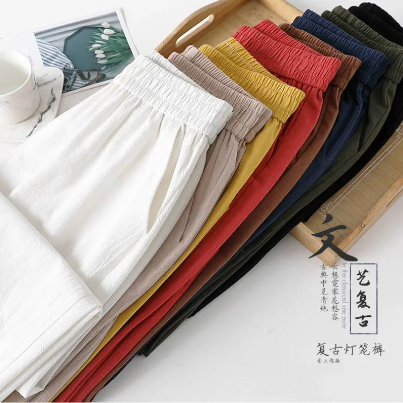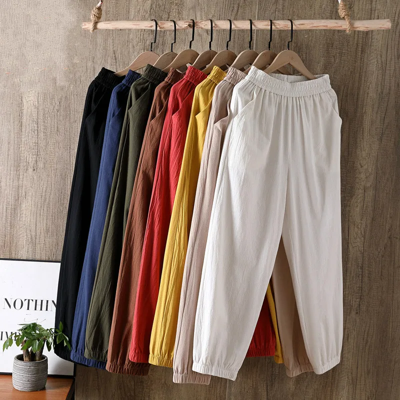 Брюки-карандаш женские из хлопка и льна, однотонные, с эластичным поясом, до щиколотки, на весну и лето, 2021