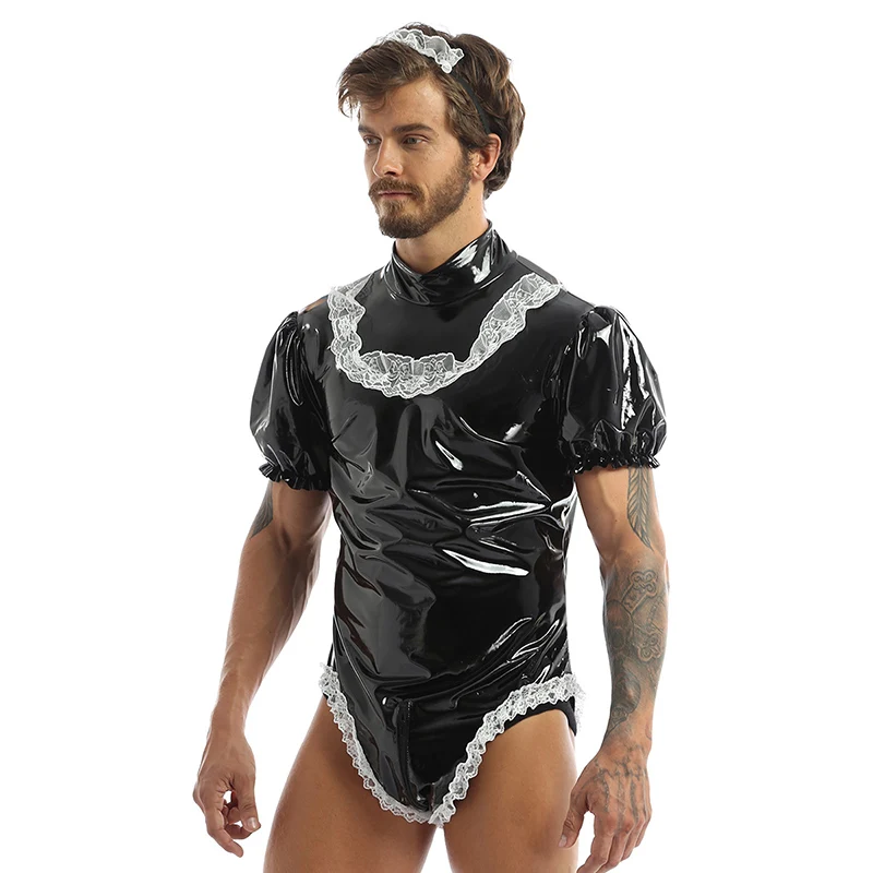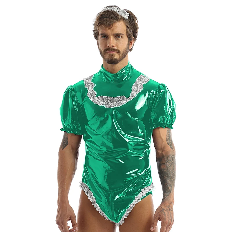 21 цвет, сексуальный мужской костюм горничной для костюмированной вечеринки, Wetlook, кружевная Клубная одежда из латекса с пышными рукавами, трико с высоким вырезом, ПВХ, боди на молнии сзади