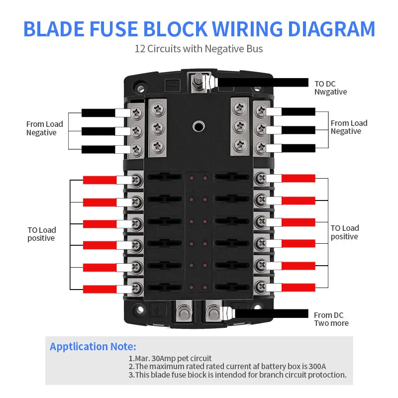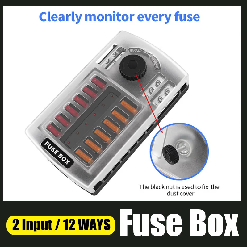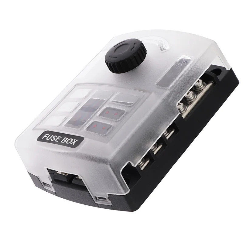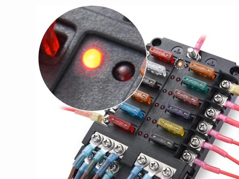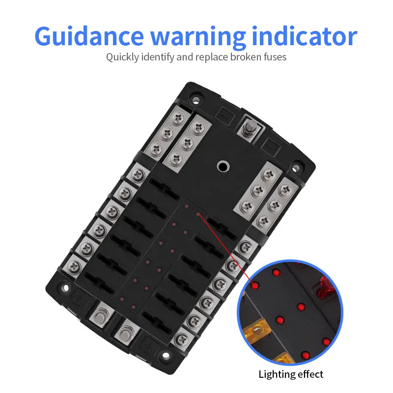 Когда горит красный светодиодный светильник, это означает, что предохранитель был отключен, и его необходимо вовремя заменить, чтобы продолжить работуК блоку предохранителей с 2 входами и 12 каналами добавлен черный винт с накатанной головкой для фиксации защитной крышки.