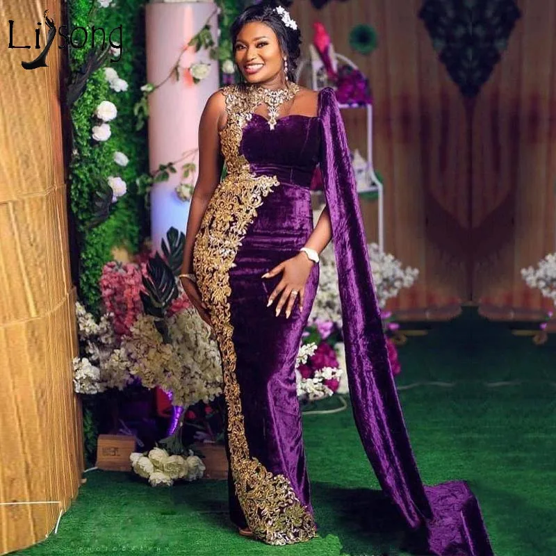 Бархатные вечерние платья, марокканский кафтан с круглым вырезом, Аппликации, золотые кружева, фиолетовый рукав-накидка, мусульманское платье для выпускного вечера, арабское платье-Русалка для вечеринки