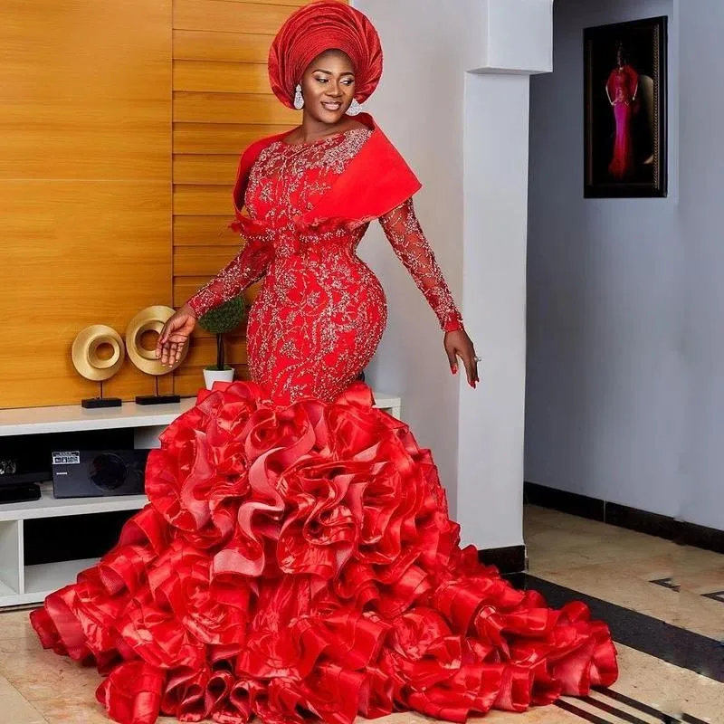 Вечернее платье-Русалка Aso Ebi, красное платье с оборками, длинными рукавами, аппликацией из бисера, для выпускного вечера, размера плюс
