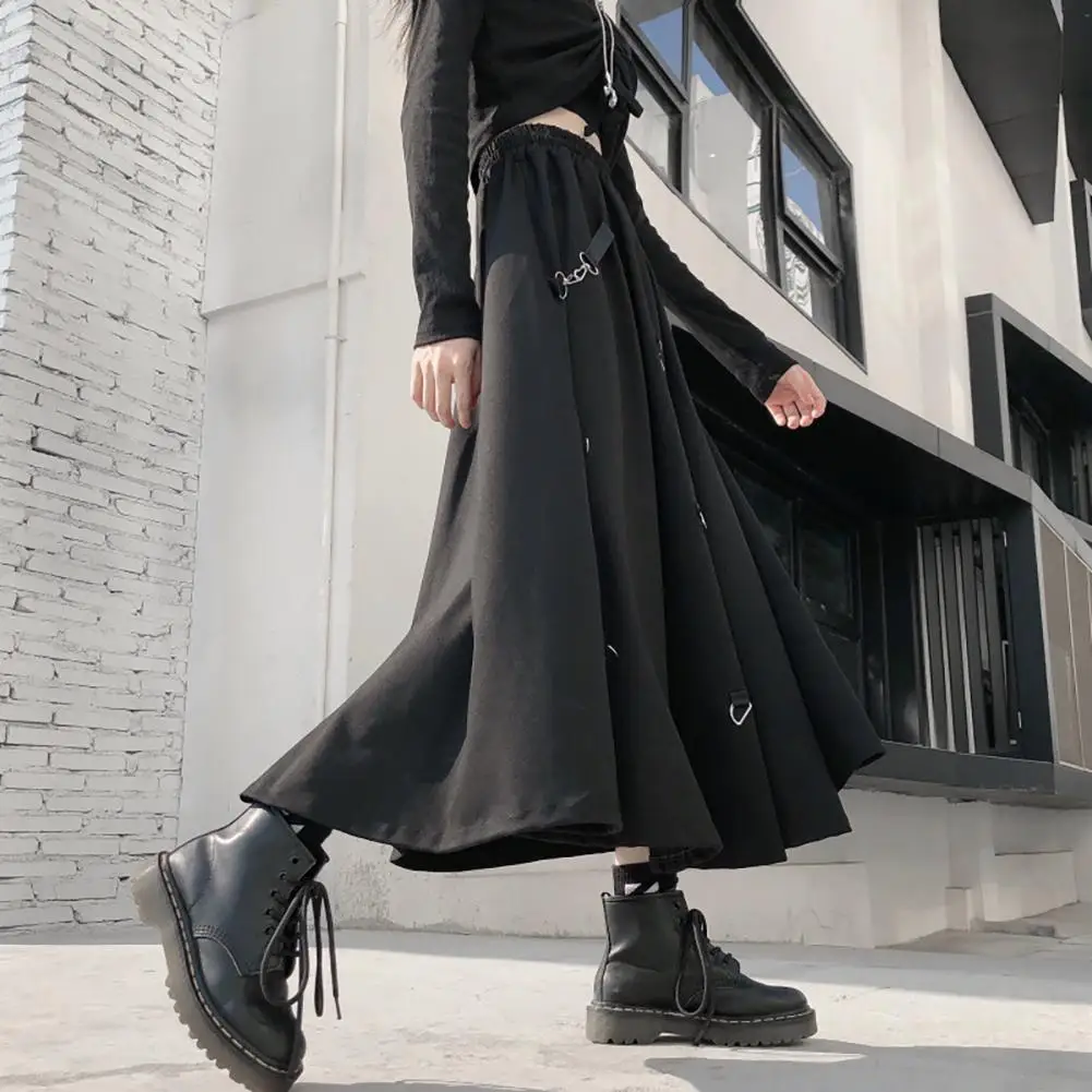 Женская длинная юбка в темном стиле с завышенной талией и подвесной пряжкой на лето и осень