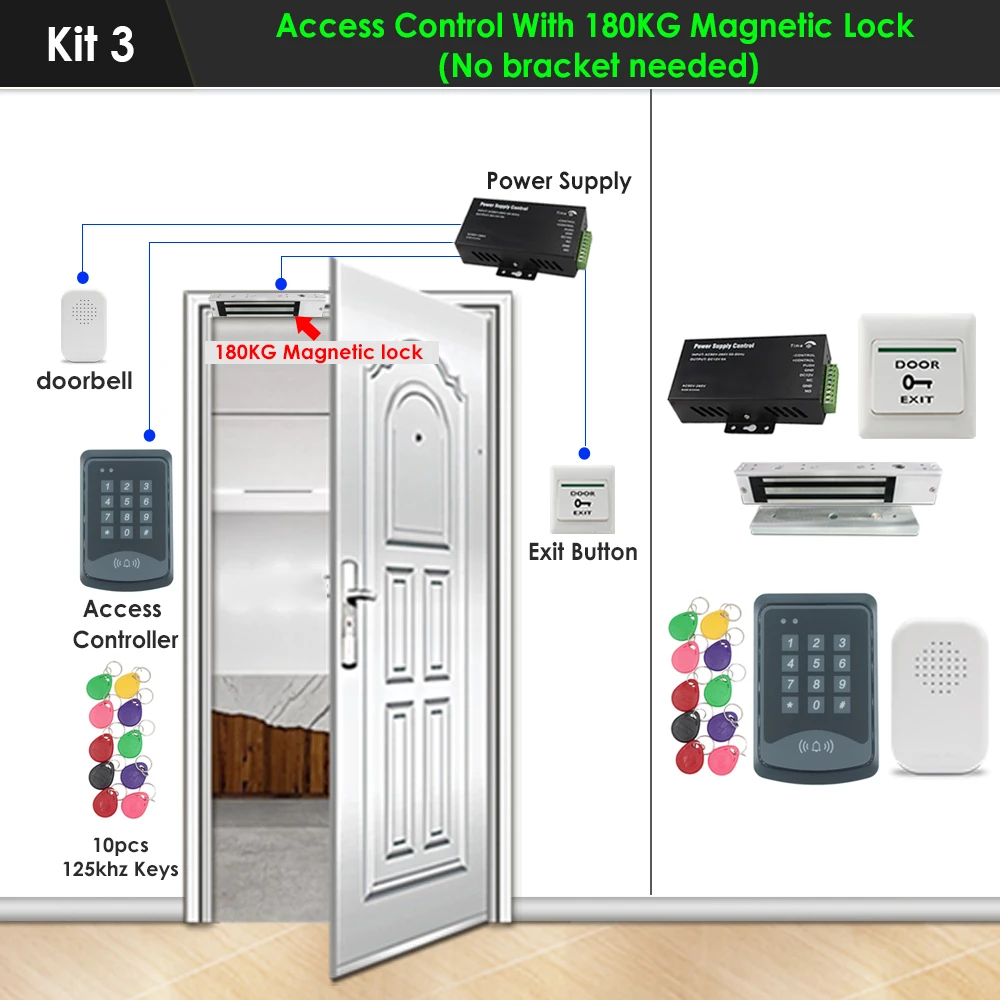 Посылка включает в себя: кнопочную панель управления доступом + блок питания + Магнитный замок 180 кг + кронштейн U + дверной звонок + кнопка выхода + 10 брелоков