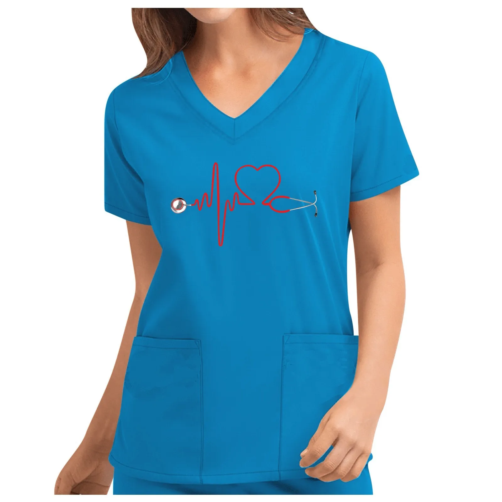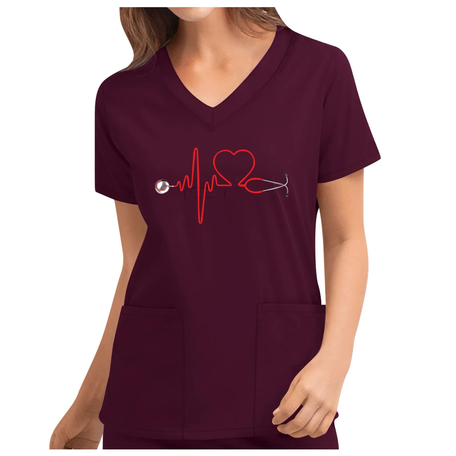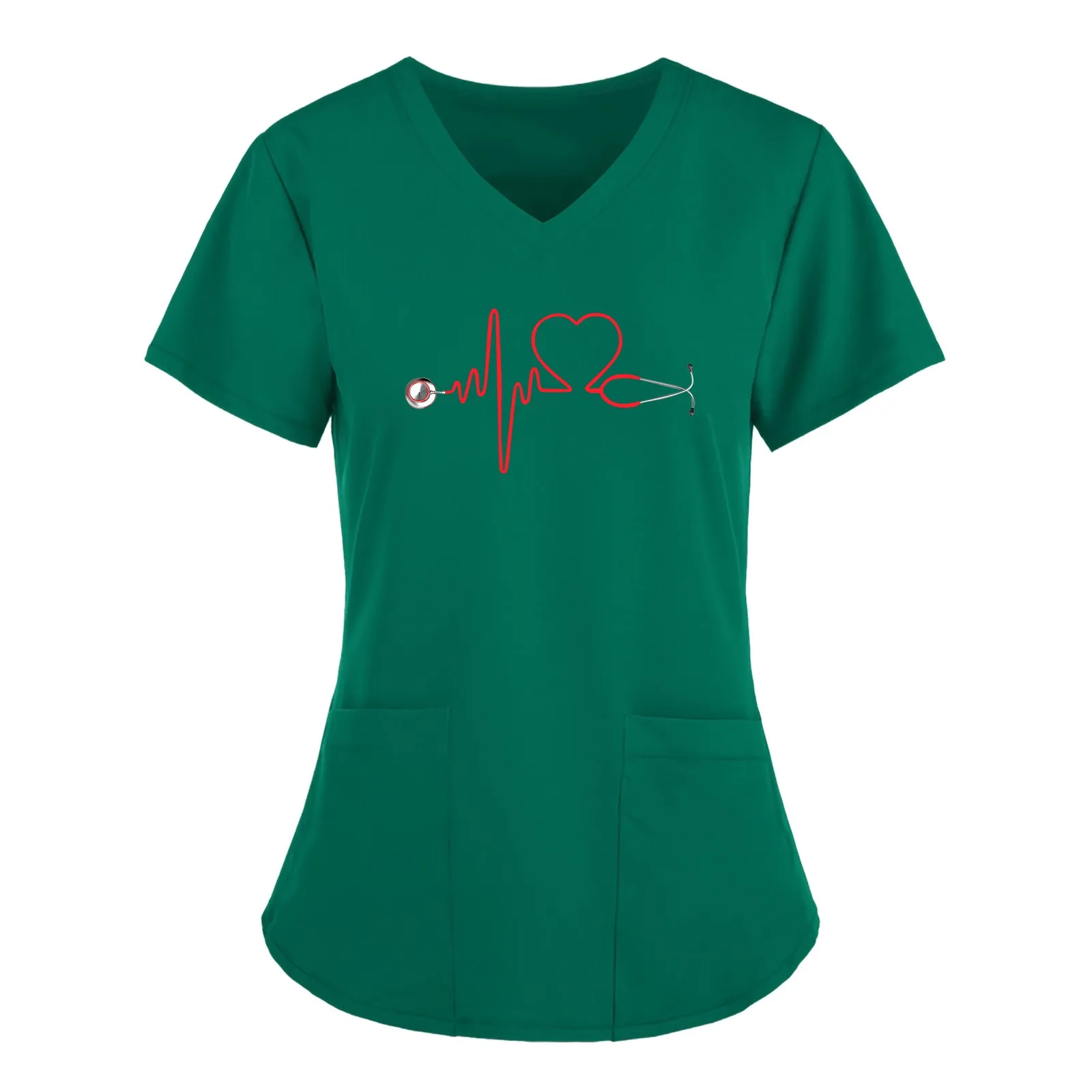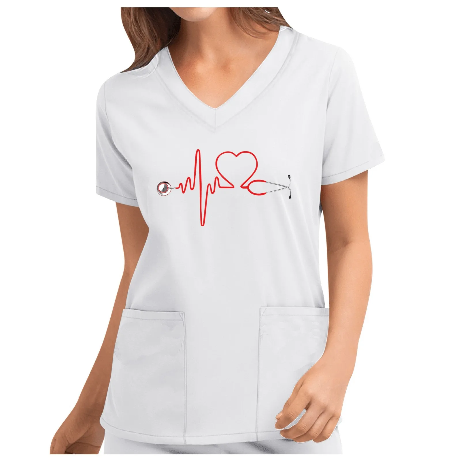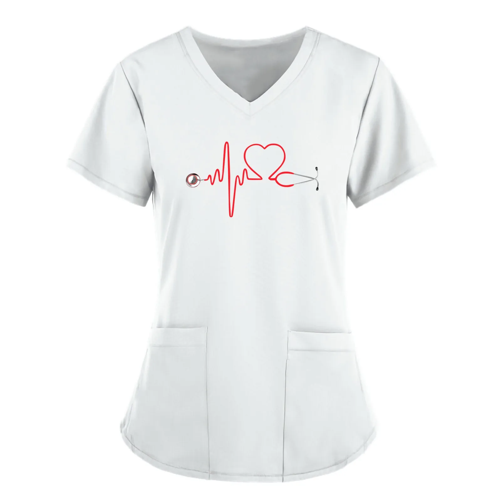 Комбинезоны для медсестер, женские футболки с коротким рукавом и принтом сердцебиения, топы с v-образным вырезом для медсестер, униформа для медсестер, футболки для медсестер, q5