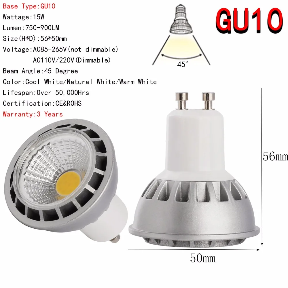 E27 GU10 MR16 светодиодный COB Точечный светильник dimble15w Точечный светильник ультраяркая Лампа DC 12V 110V 220V или 85-265V Теплый Холодный белый