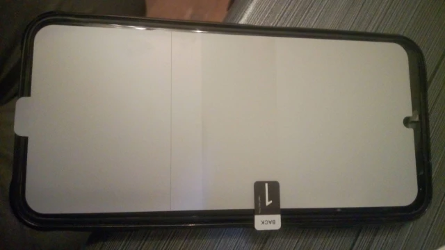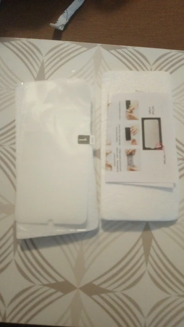 Это Силиконовый протектор для экранов телефона, он поставляется с салфетками для очистки и сушки экрана и шпателем для выпрямления и предотвращения остатков пузырьков, он защищен между двумя листами толщиной около 3 или 4 мм полиэстера (синтетическая белая пробка), это нормально.