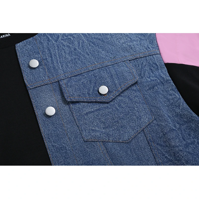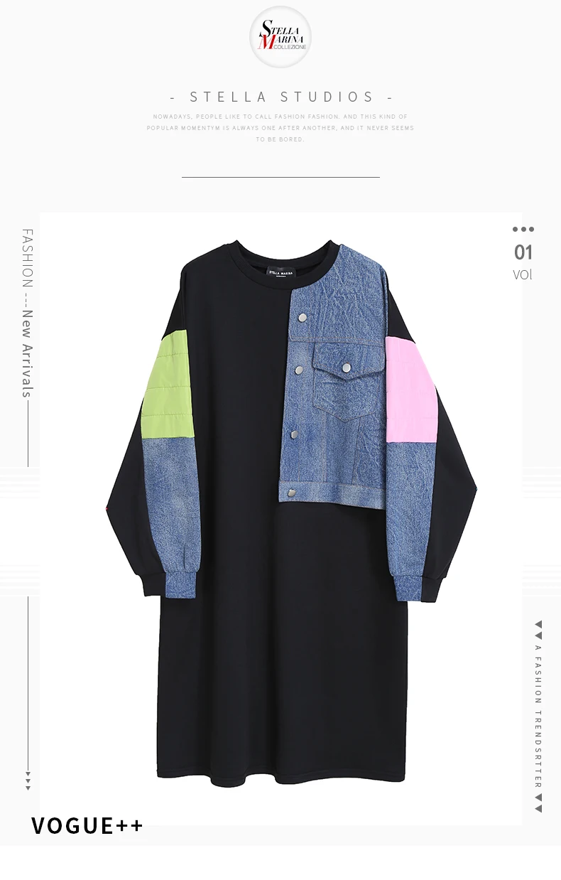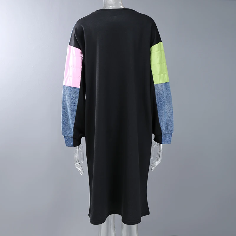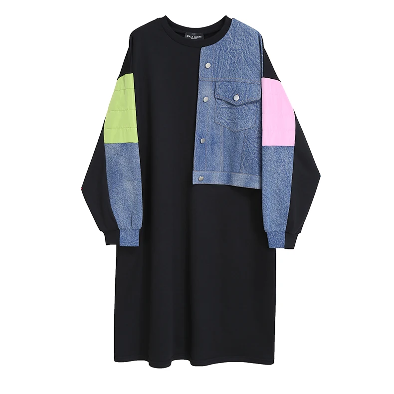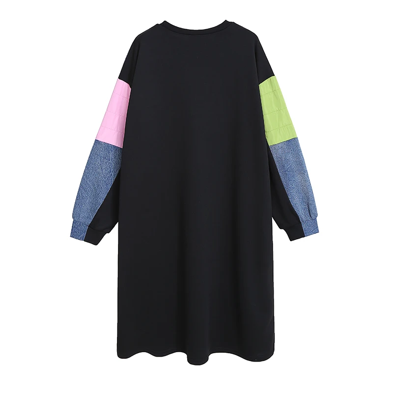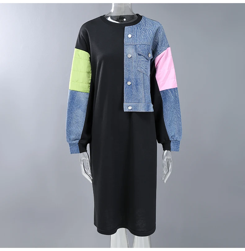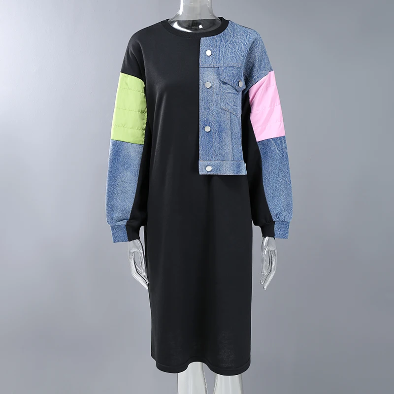 Новинка, прямое весеннее женское платье с длинным рукавом, плюс размер, джинсовое лоскутное женское уникальное уличное повседневное платье, Стильное женское платье 8051