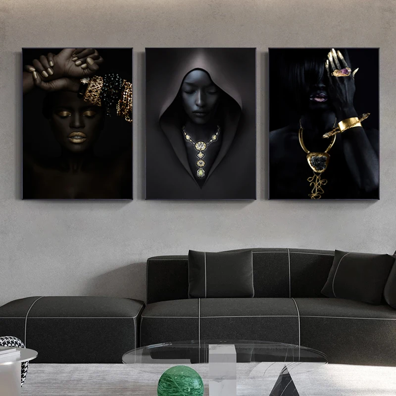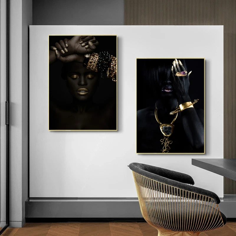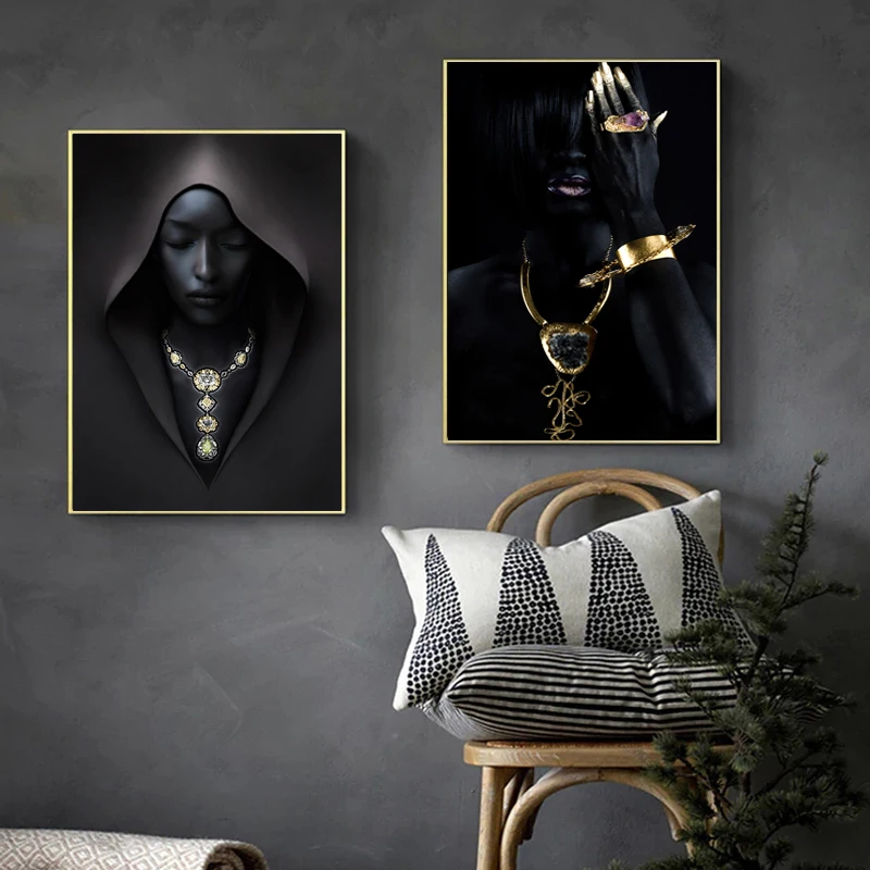 Черные женские золотые украшения картина маслом на холсте настенные художественные плакаты печать, Картина Настенная для гостиной домашний Настенный декор