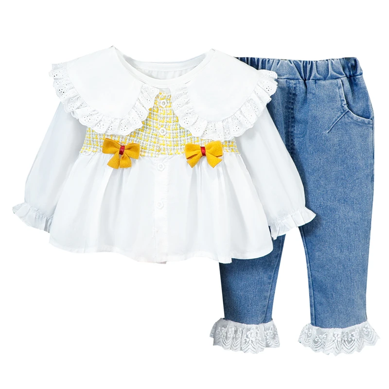 Одежда для малышей на весну и осень, комплекты одежды для маленьких девочек, топы принцессы с кружевным бантом, джинсы, милая детская одежда