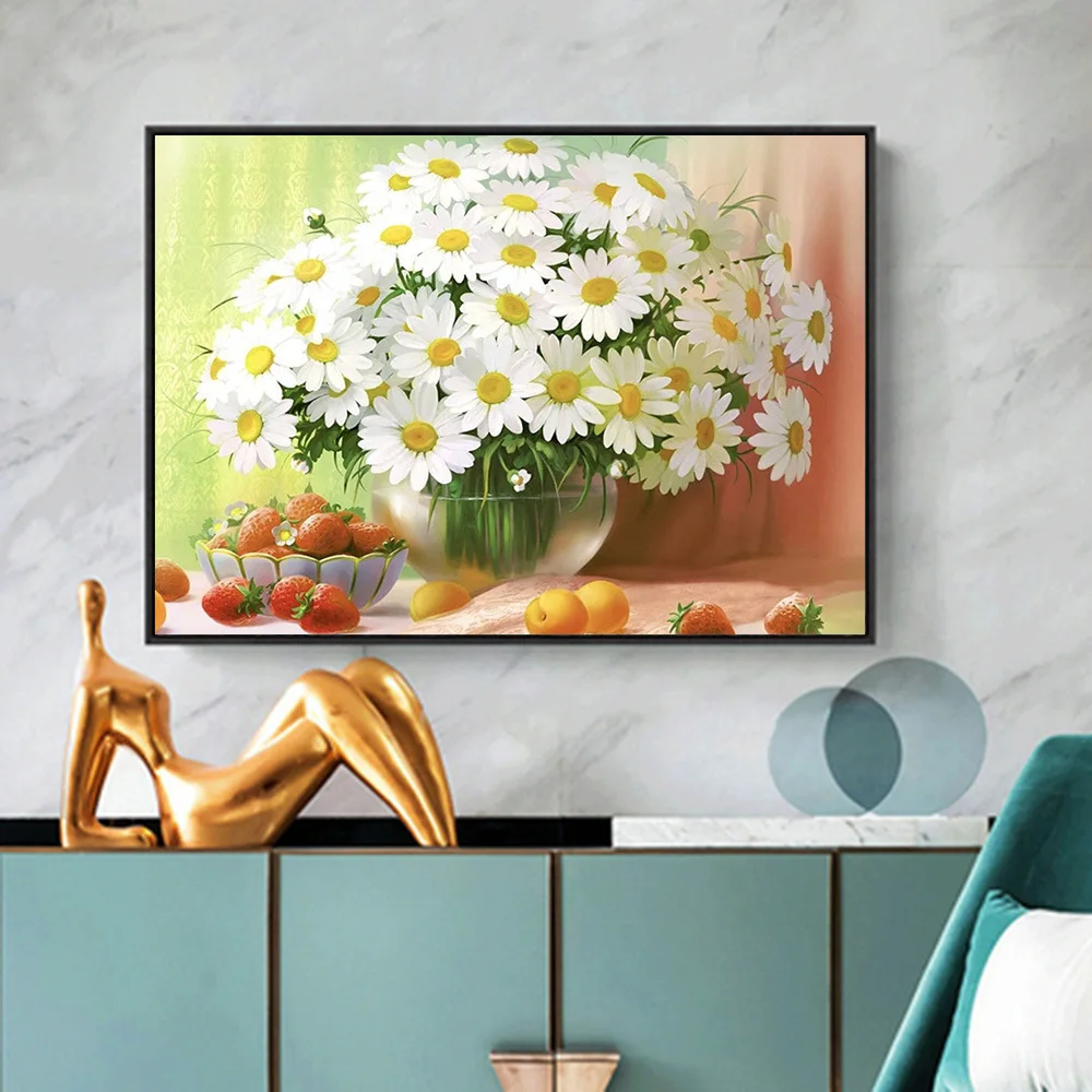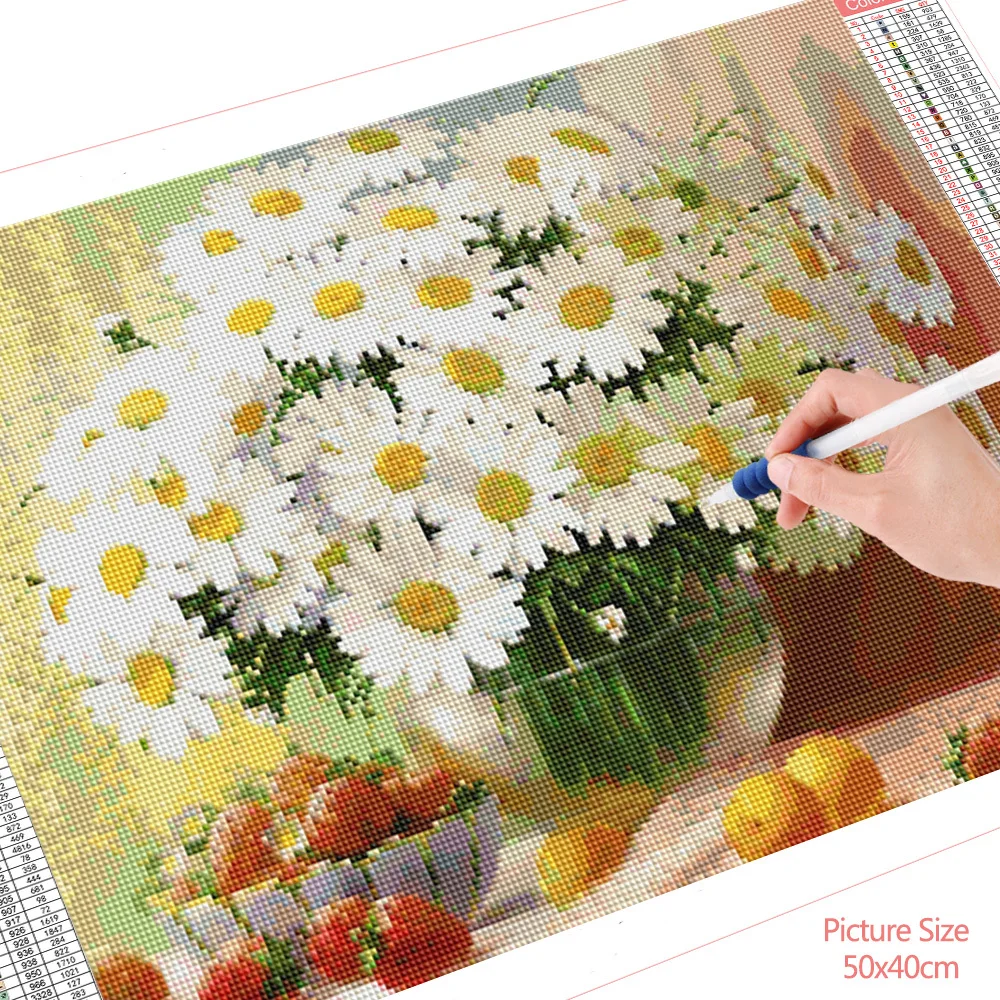 Алмазная живопись HUACAN, полноразмернаякруглая вышивка с цветами, белыми маргаритками, вышивка крестиком, домашнее искусство, Настенный декор