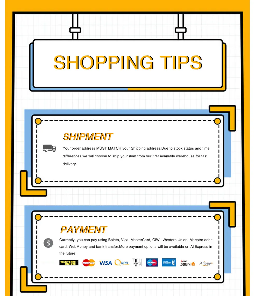 1. Заказы обрабатываются своевременно после подтверждения оплаты. 2. Полная оплата должна быть произведена в течение 7 дней после размещения вашего заказа, иначе заказ будет недействительным или отменен системой. 3. Убедитесь, что вы завершили всю подробную информацию, такую как контактное лицо, адрес, почтовый индекс и номер телефона при заполнении информации вашего покупателя.