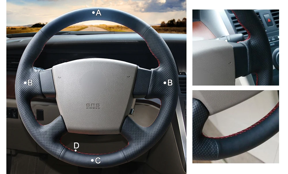 Сшитая вручную черная оплетка рулевого колеса из искусственной кожи...