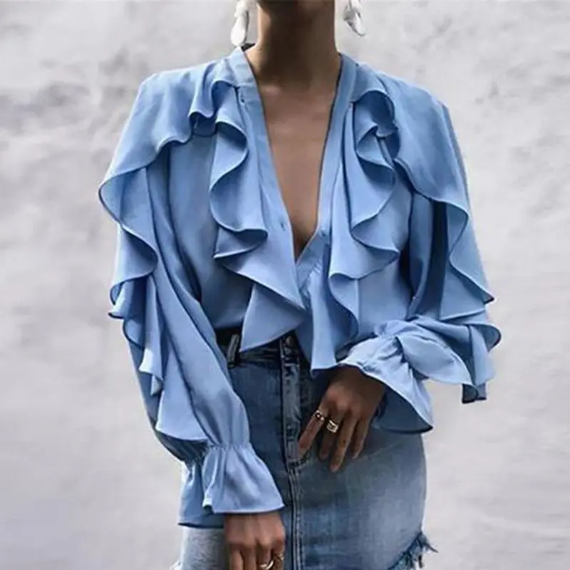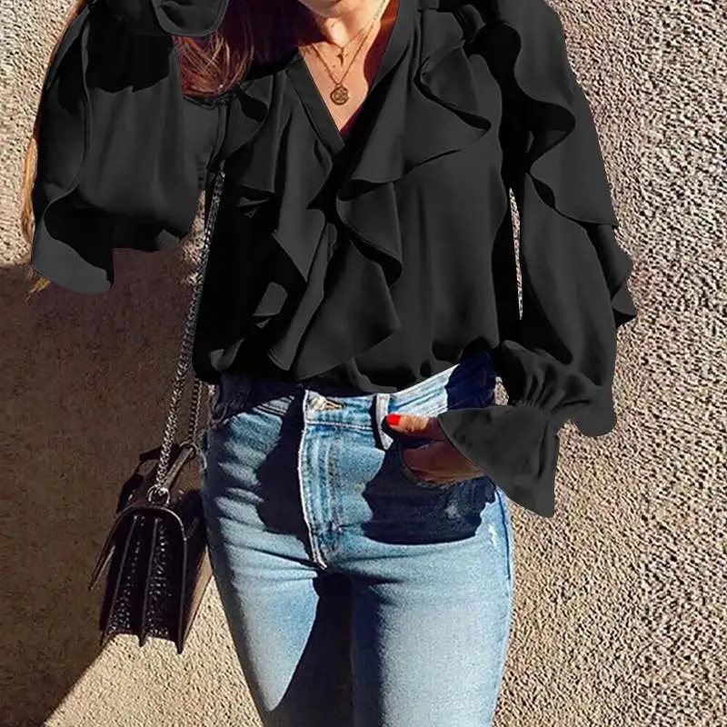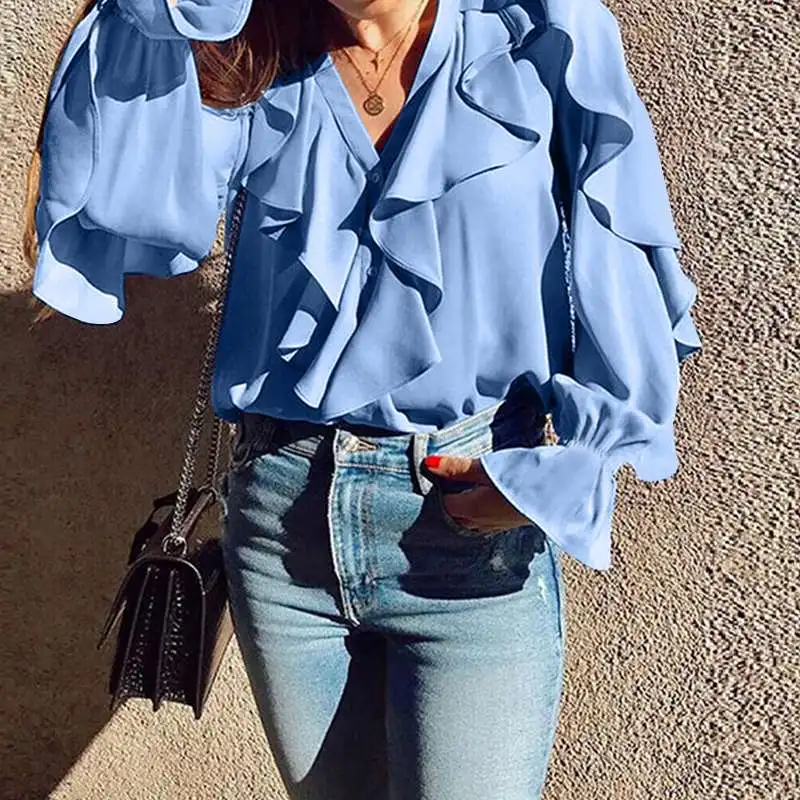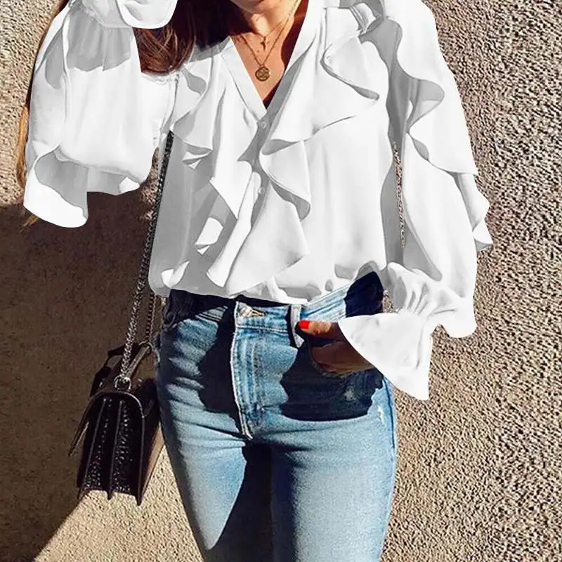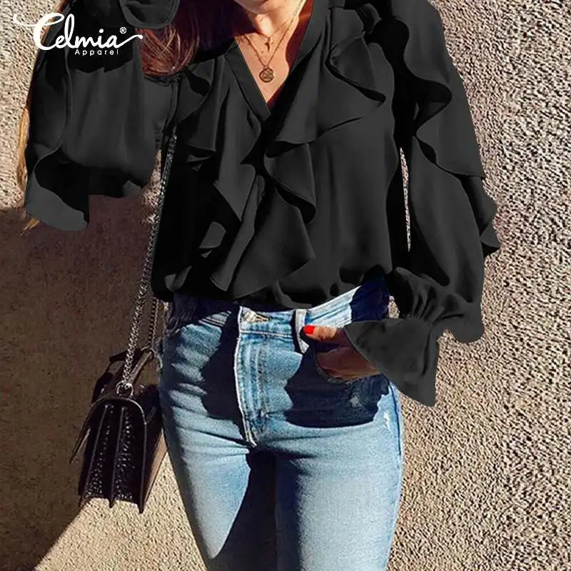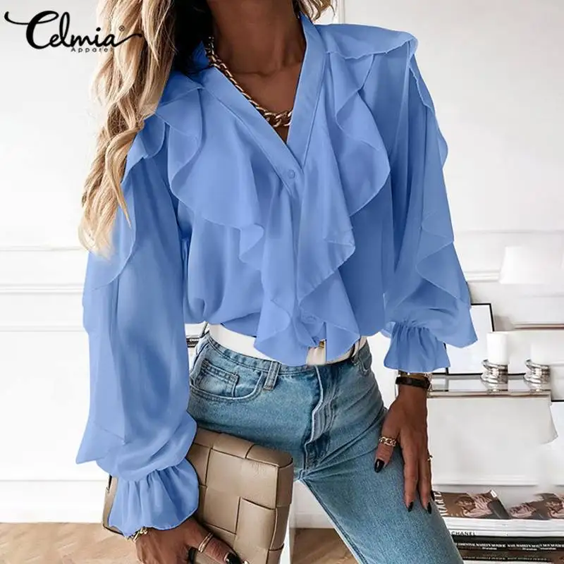 Женская белая блузка Celmia 2022, модные элегантные Гофрированные Топы, пикантная рубашка с V-образным вырезом и длинным рукавом, Женская Повседневная Уличная одежда на пуговицах, блузы