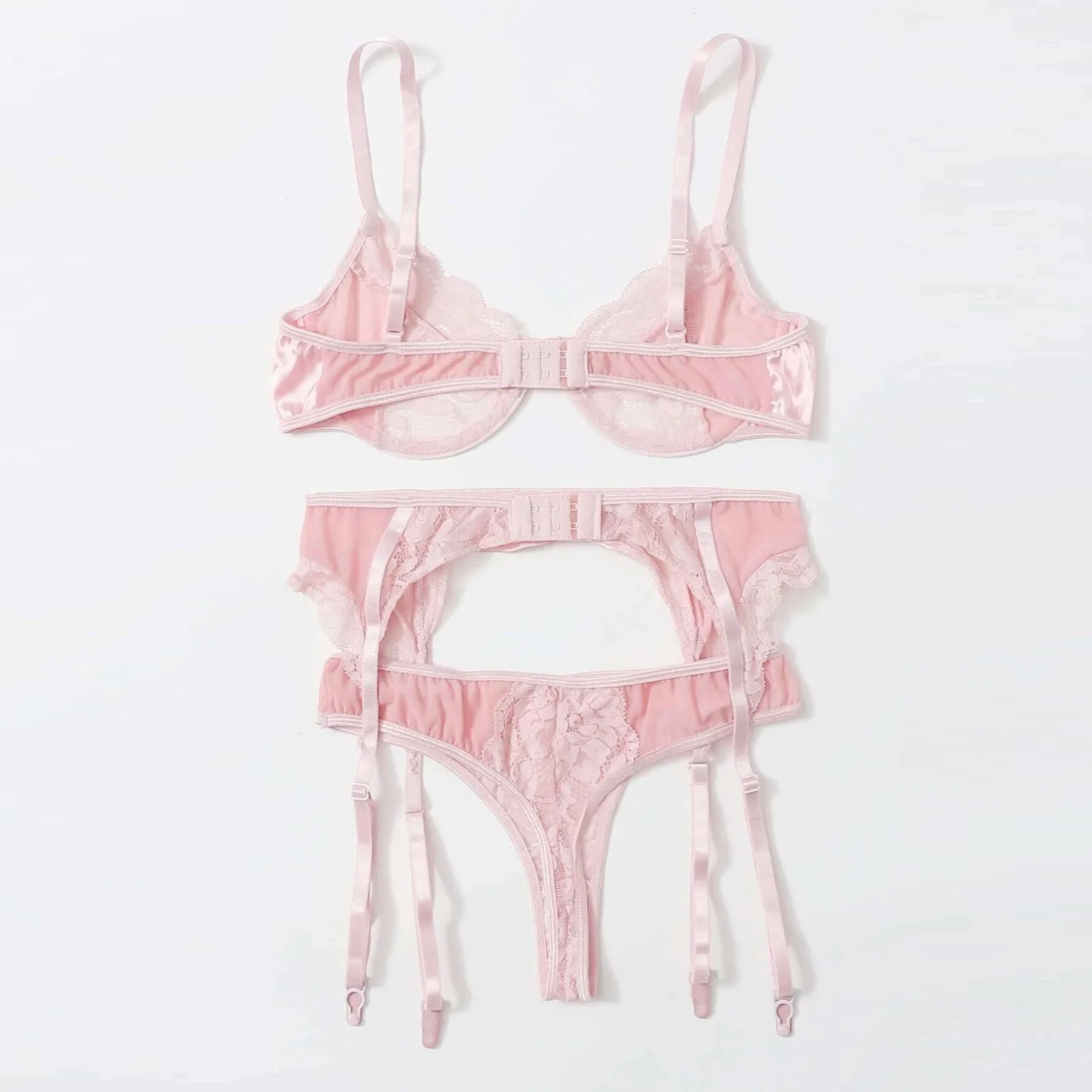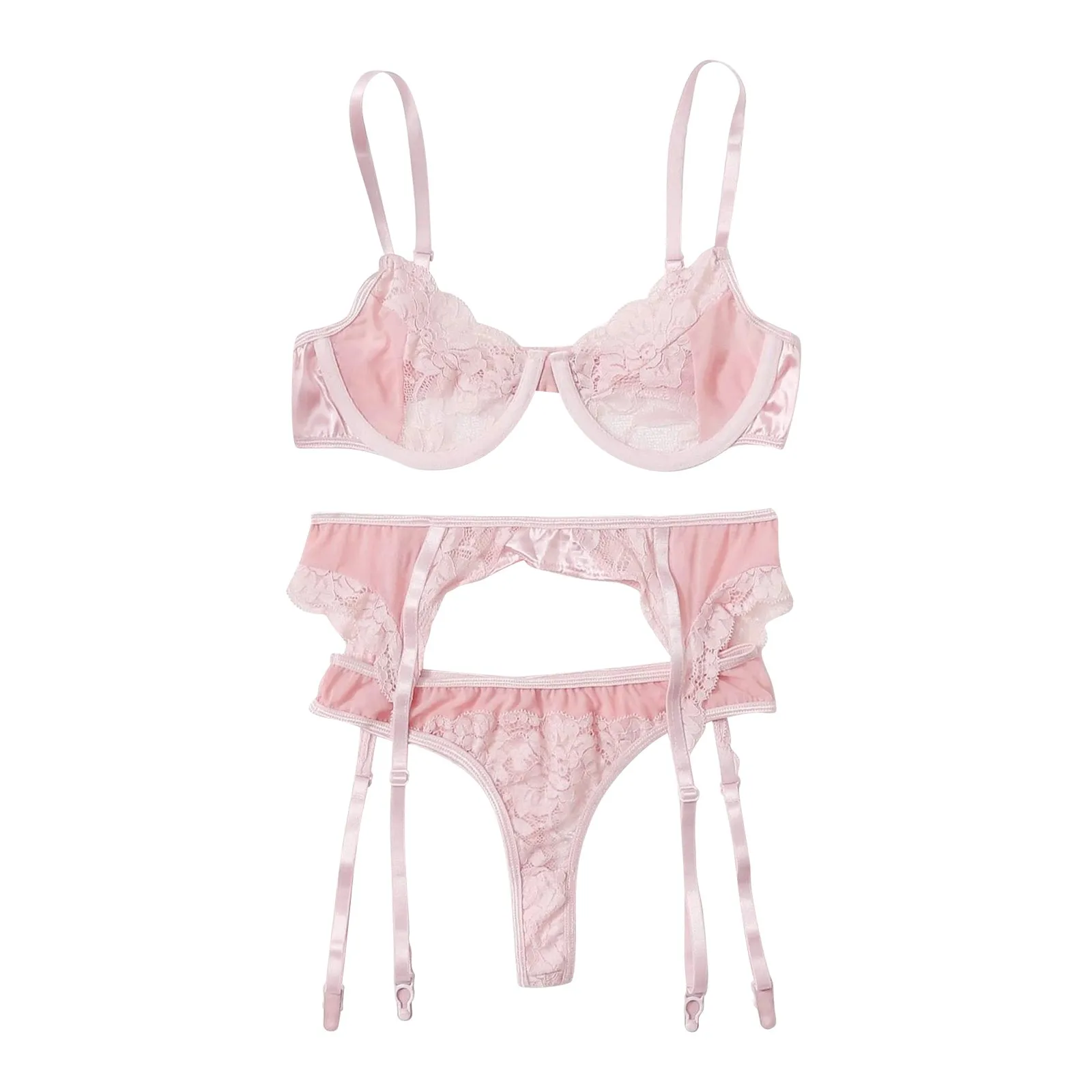 Женский бюстгальтер с цветочной вышивкой, бюстгальтер на косточках, стринги, костюм, кружевное соблазнительное нижнее белье с подвязками, стринги с низкой посадкой, Розовое женское нижнее белье