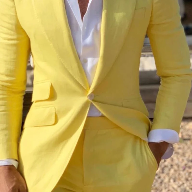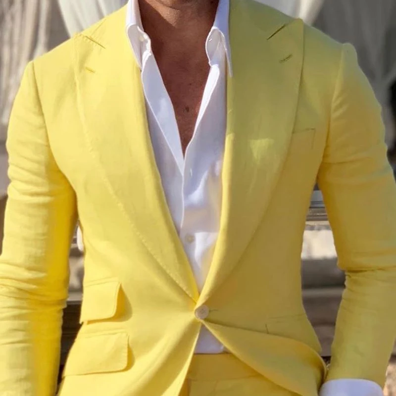 Костюм пляжный мужской из двух предметов, желтый льняной смокинг с заостренным лацканом, модный Блейзер и брюки, приталенный силуэт, свадебная мода