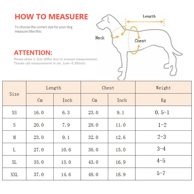 1. Пожалуйста, проверьте вашего питомца замеры изделий сделаны вручную, поэтому убедитесь в том, что одежда подходит для домашних животных перед тем, как вы заказываете (1 дюйм = 2,54 см)2. При выборе размера, для растущего питомца, пожалуйста, учитывайте время доставки, вам лучше выбрать больший размер!