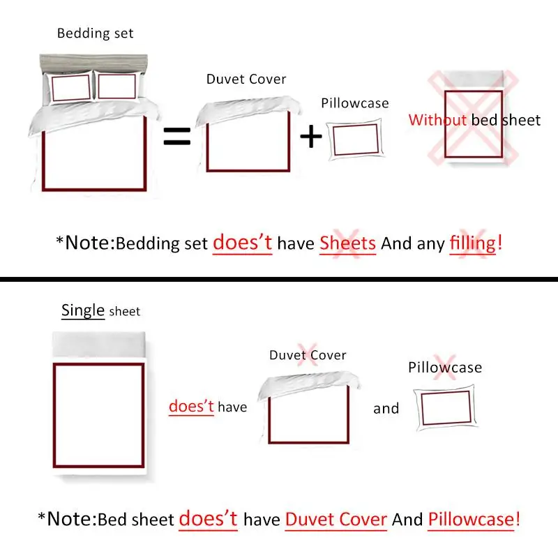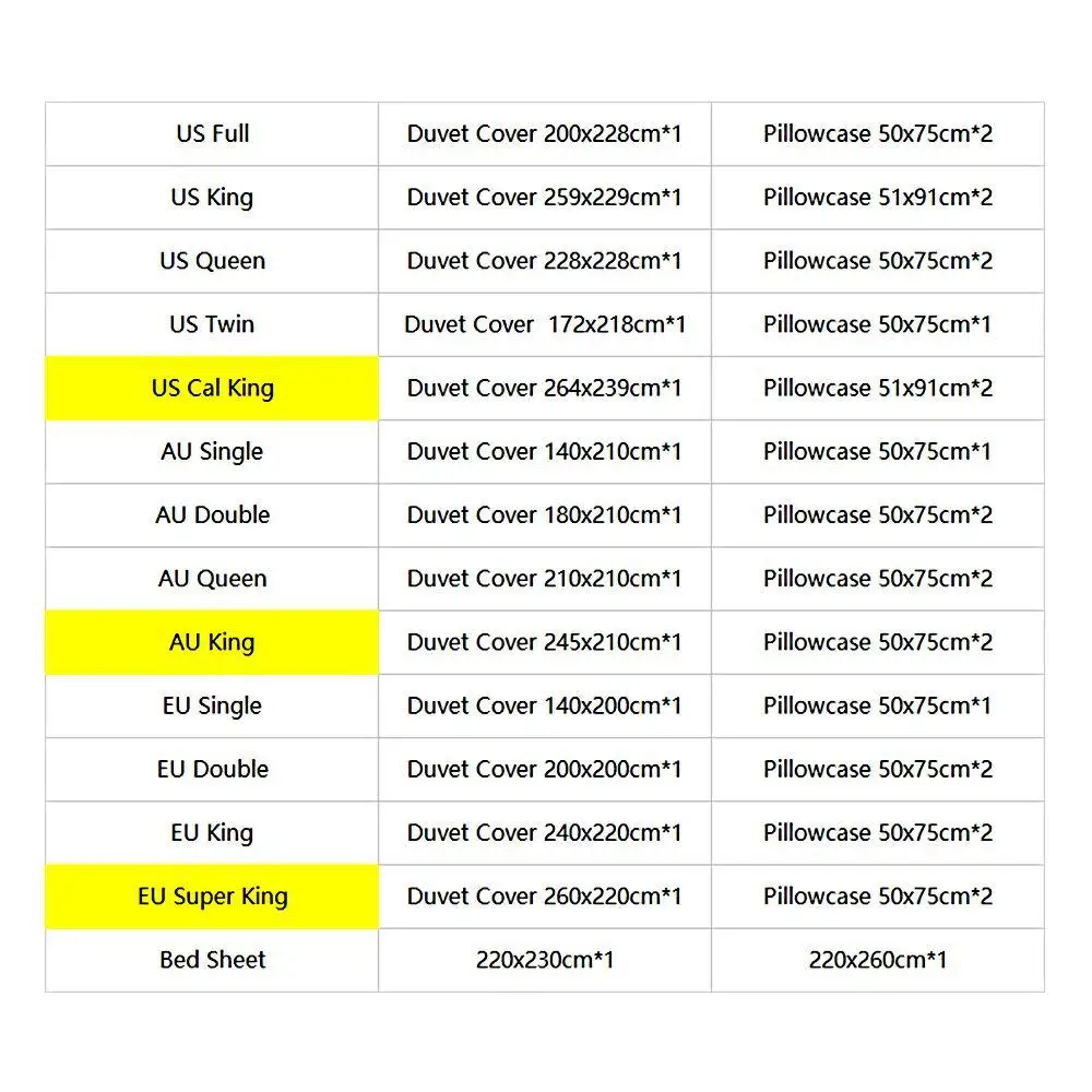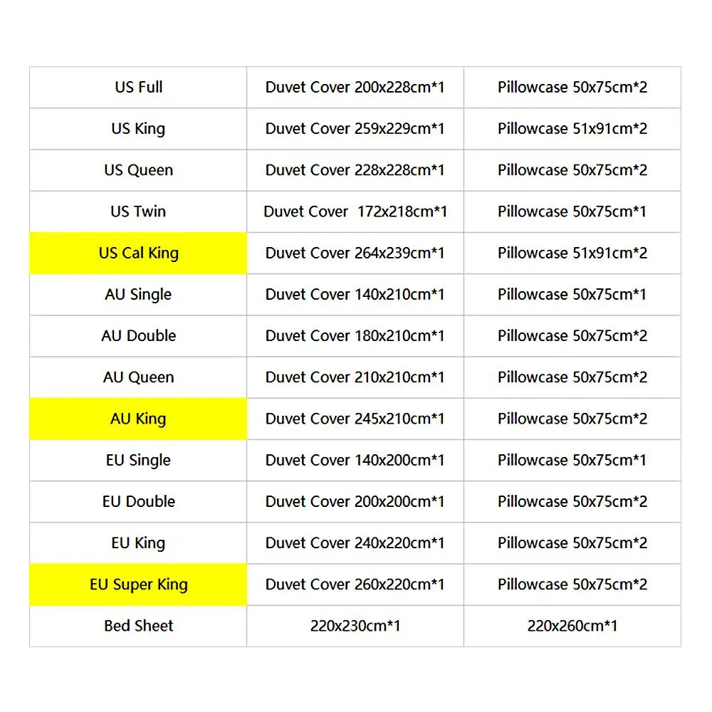 * Из-за шитья и термопереноса, измерения вручную, погрешность в размере может составлять около 5-8 см. (Комплект постельного белья не включает наполнитель). US Twin: 1 пододеяльник 172x218 см, 1 Наволочка 50x75 см. Полный комплект США: 1 пододеяльник 200x228 см, 2 наволочки 50x75 см. Королева США: 1 пододеяльник 228x228 см, 2 наволочки 50x75 см. Король США: 1 пододеяльник 259x229 см, 2 наволочки 51x91 см. US Cal King: 1 пододеяльник 264x239 см, 2 наволочки 51x91 см. AU Single: 1 пододеяльник 140x210 см, 1 Наволочка 50x75 см. AU Double: 1 пододеяльник 180x210 см, 2 наволочки 50x75 см. AU Queen: 1 пододеяльник 210x210 см, 2 наволочки 50x75 см. AU King: 1 пододеяльник 245x210 см, 2 наволочки 50x75 см. Европейский одинарный: 1 пододеяльник 140x200 см, 1 Наволочка 50x75 см. EU Double: 1 пододеяльник 200x200 см, 2 наволочки 50x75 см. EU King: 1 пододеяльник 240x220 см, 2 наволочки 50x75 см. EU Super King: 1 пододеяльник 260x220 см, 2 наволочки 50x75 см. Наволочка: 1 шт. 50x75 см или 1 шт. 51x91 см. Простыня: 1 шт. 220x230 см или 1 шт. 220x260 см * это изображение дизайна комплекта постельного белья. Нереальное изображение, поэтому в реальной жизни может немного отличаться. Это может немного отличаться от товара, который вы видели с реальным товаром, из-за разных экранов мониторов, солнечного света, фона. * Этот комплект постельного белья на заказ. Но он будет отправлен очень быстро, и вы получите номер отслеживания при отправке.