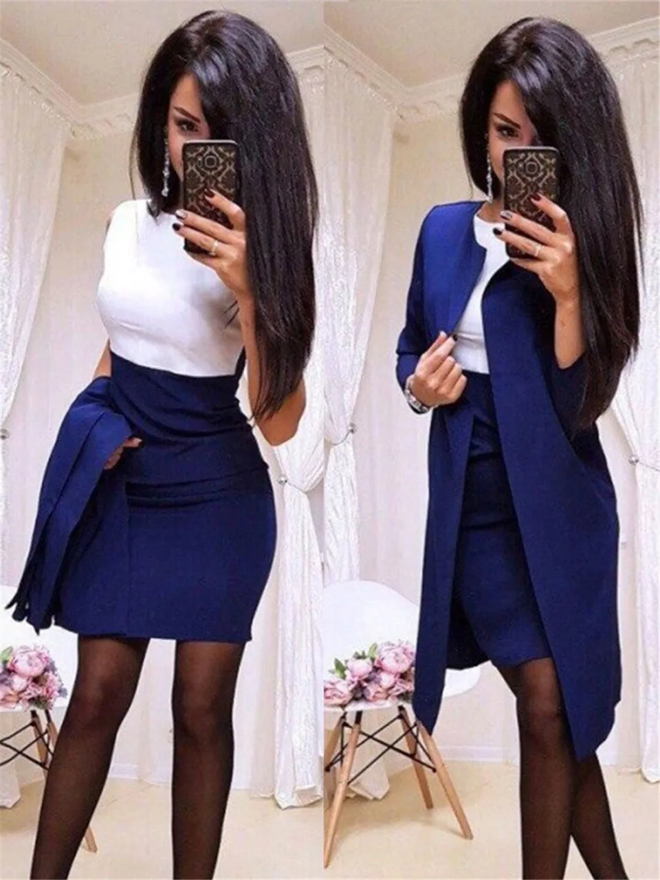 Элегантный женский комплект для офиса, однотонный лоскутный дизайн, повседневное облегающее платье с круглым воротником, осеньзима, Женский комплект из 2 предметов