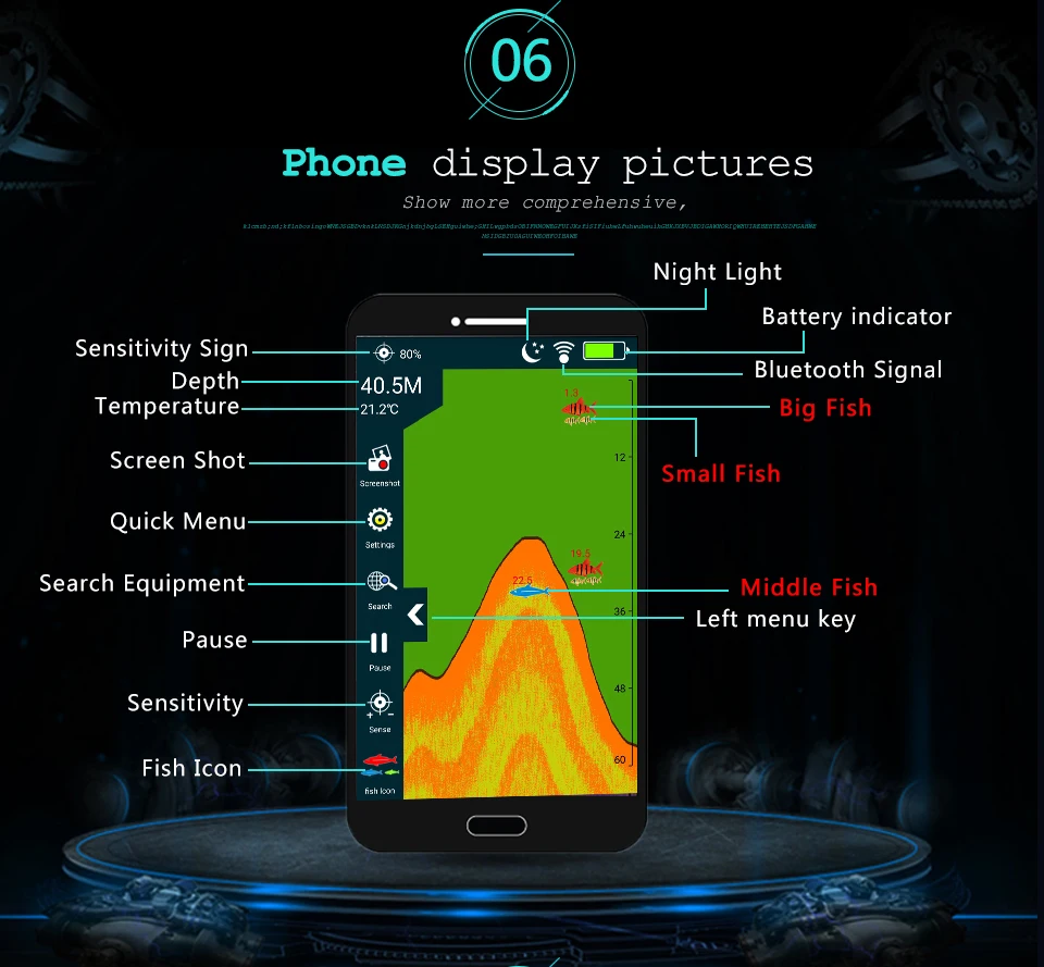 1. Сонар и рэдиЧастота гидролокатора: 125 кГцУгол свечения гидролокатора: 90 градусовРадиочастота: 2,4 ГГцРабочая температура: -10 ~ 60 ℃2. Источник питания:Батарея: литиевая батарея 3,7 вВремя работы: 20 часов (Полная батарея)