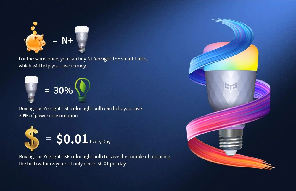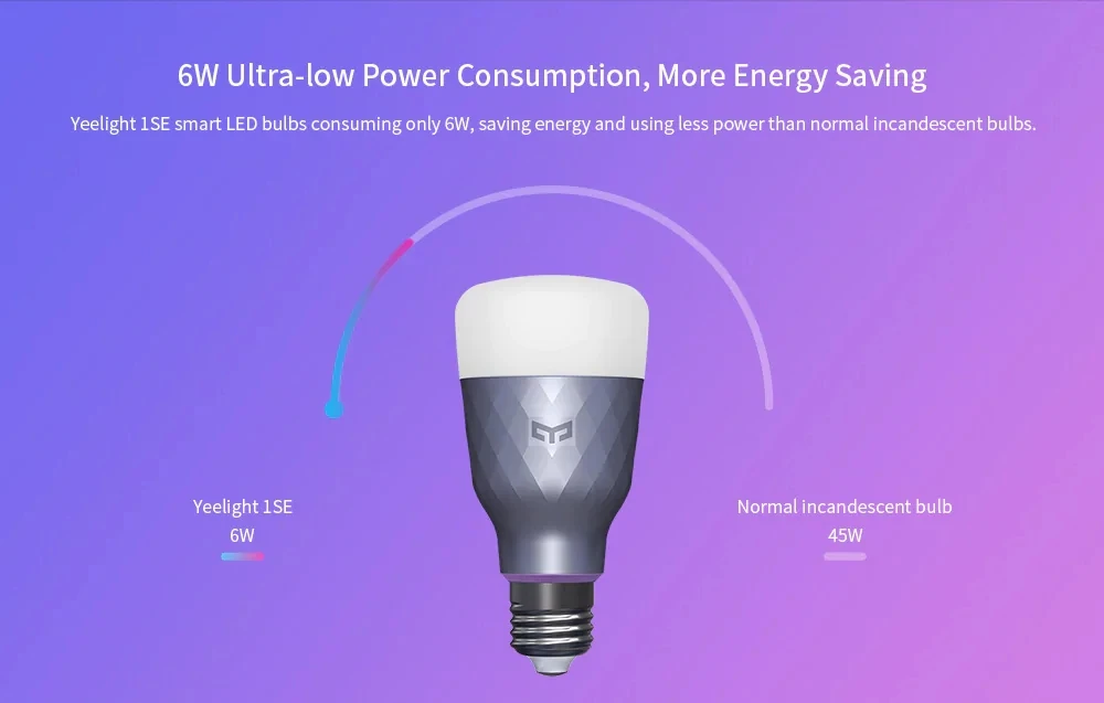 Светодиодный смарт-лампы Yeelight 1SE потребляют всего 6 Вт, экономя энергию и используя меньшую мощность, чем обычные лампы накаливания.