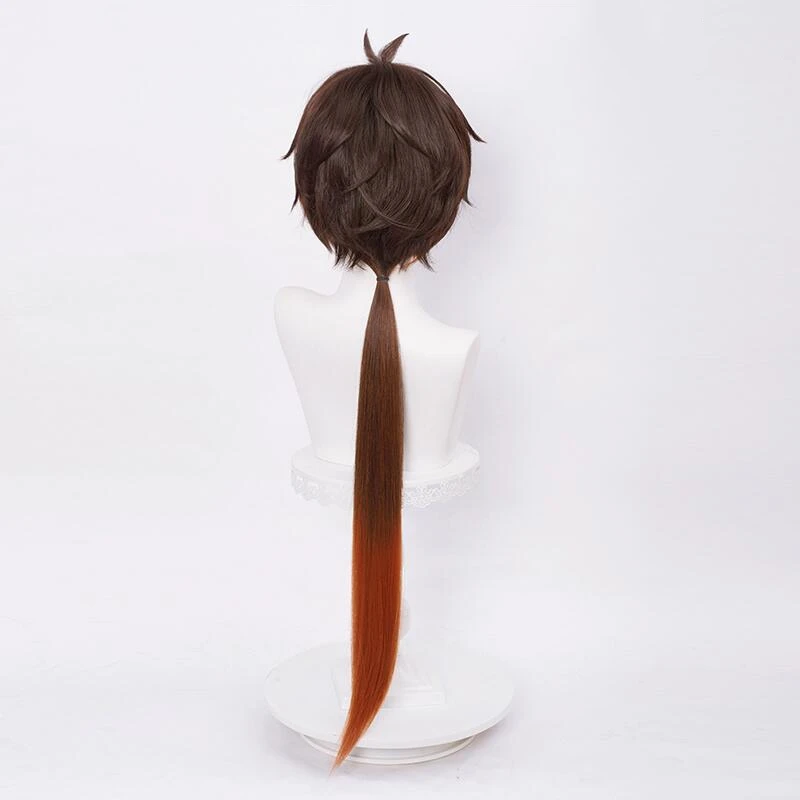 Парик для косплея Genshin Impact Zhongli, длиной 90 см, прямой конский хвост, коричневые, термостойкие волосы с градиентом, для ролевых игр на Хэллоуин