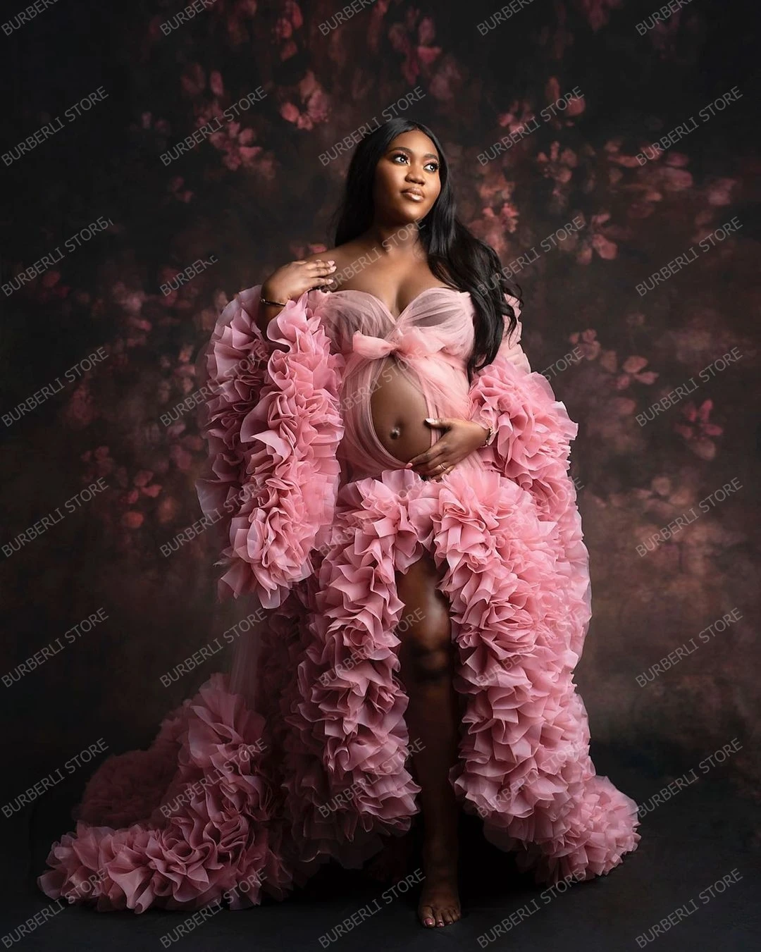 Красивые розовые тюлевые Длинные платья для беременных с пышными рукавами и оборками многоярусные женские платья Ночные платья длинный халат