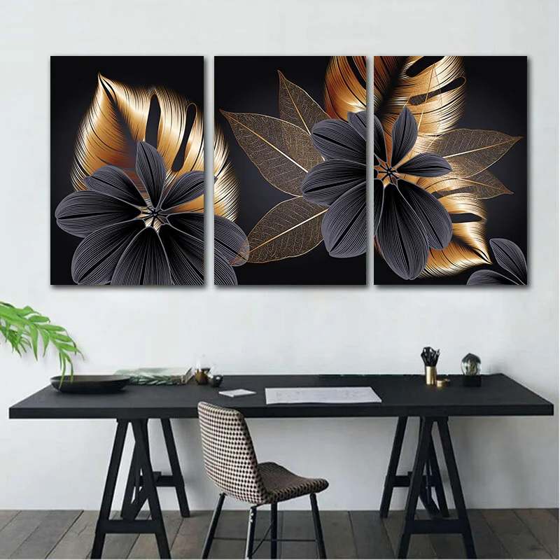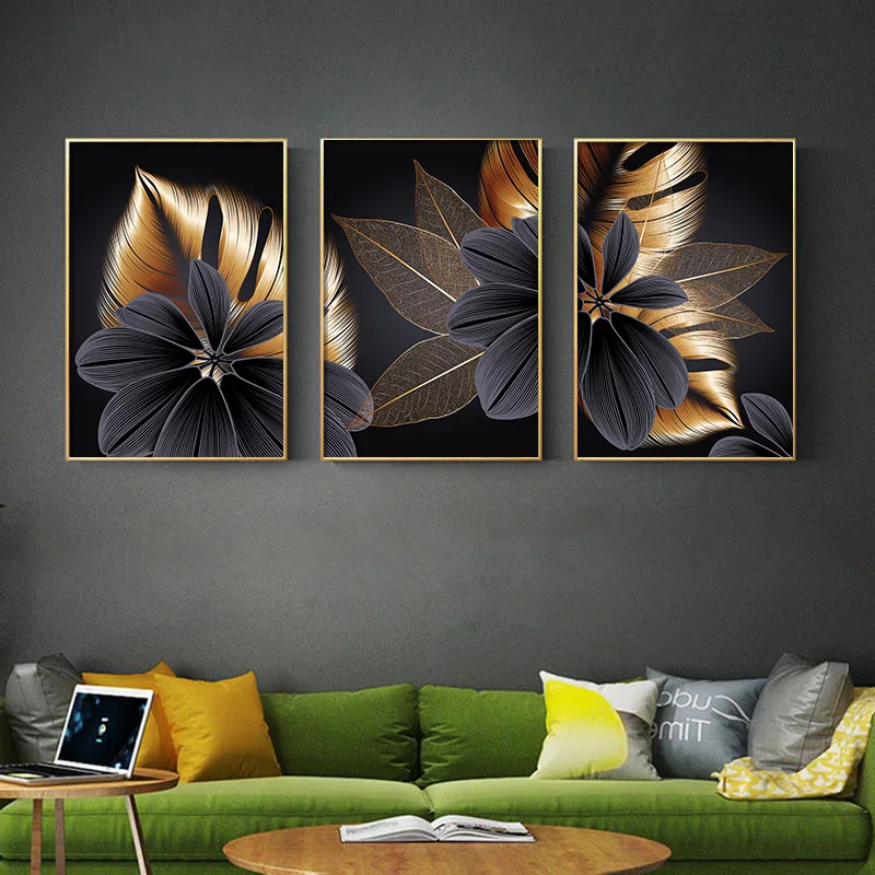 Роскошная абстрактная настенная Картина на холсте в скандинавском стиле украшение Черное золото растение лист холст плакат печать современный Декор для дома картина