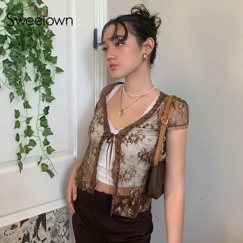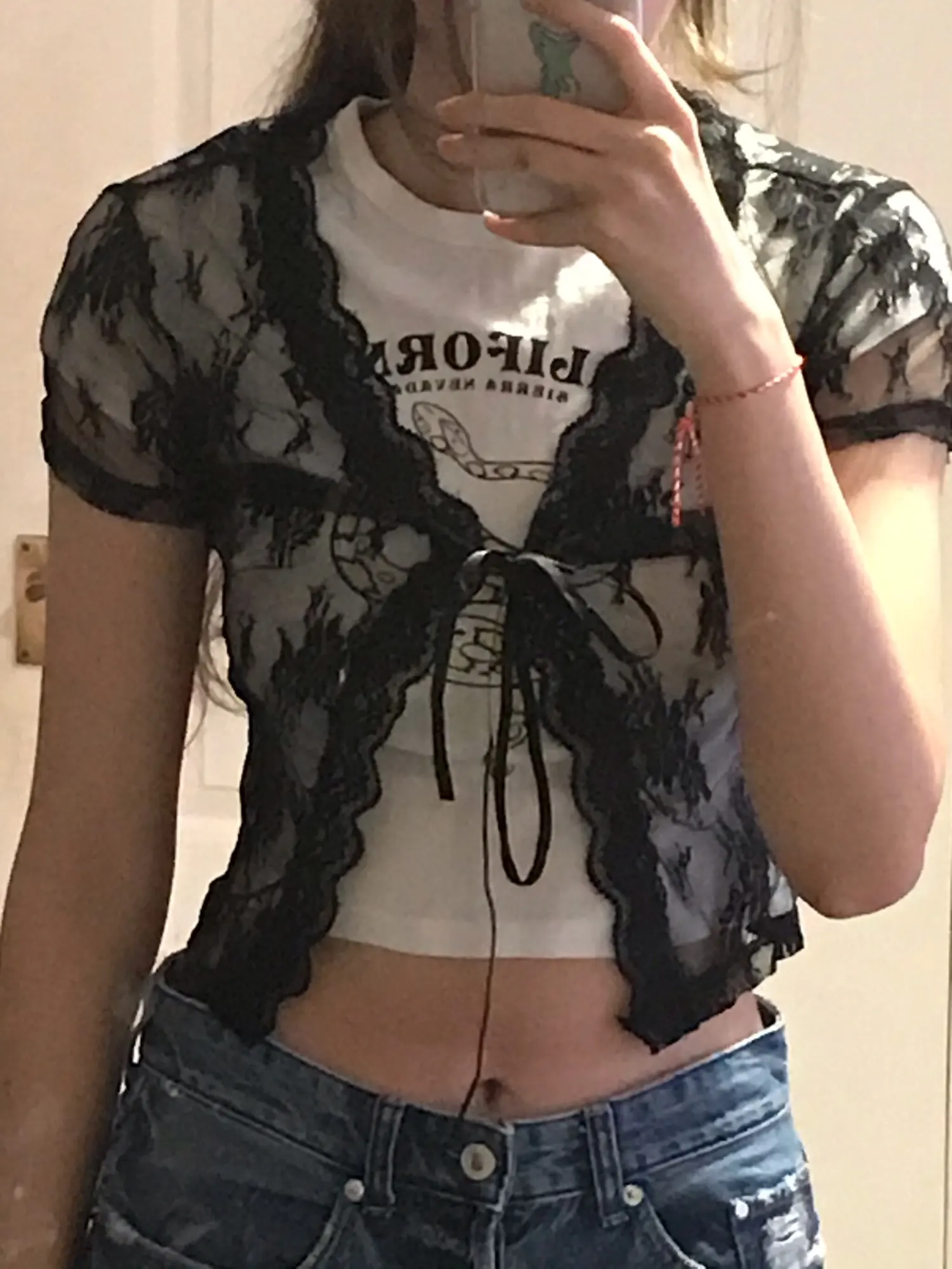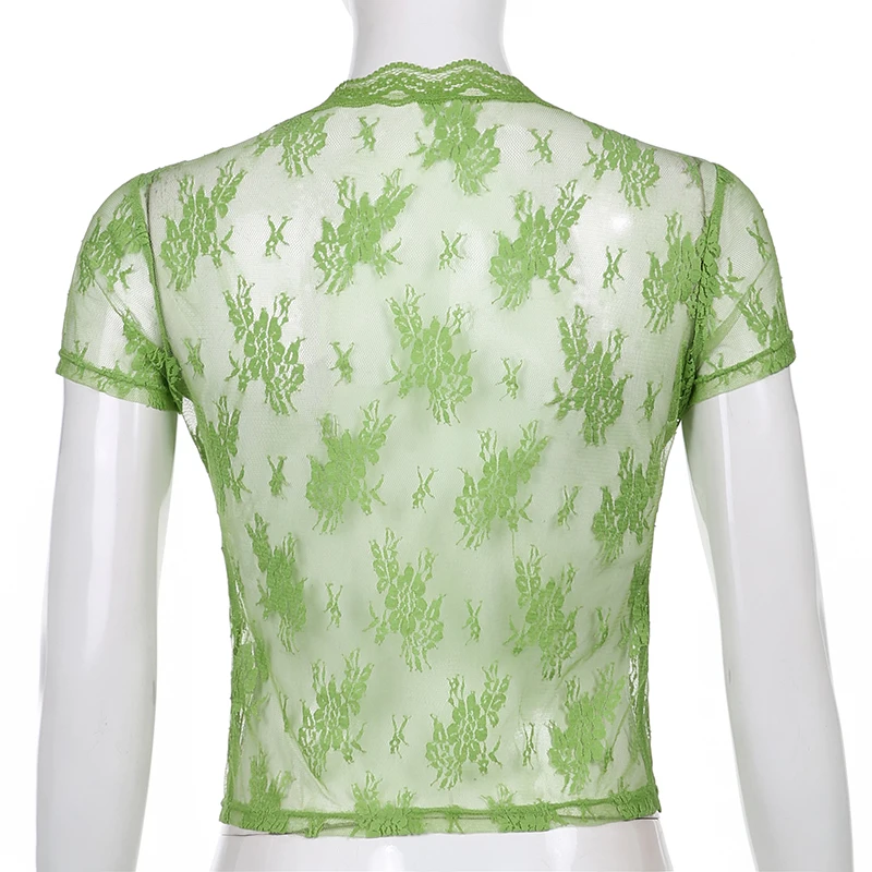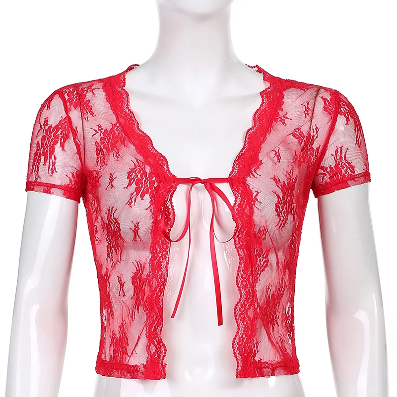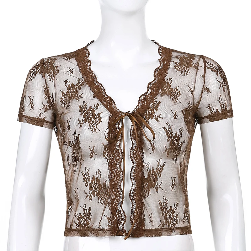 Женский кружевной топ, с коротким рукавом, V-образным вырезом