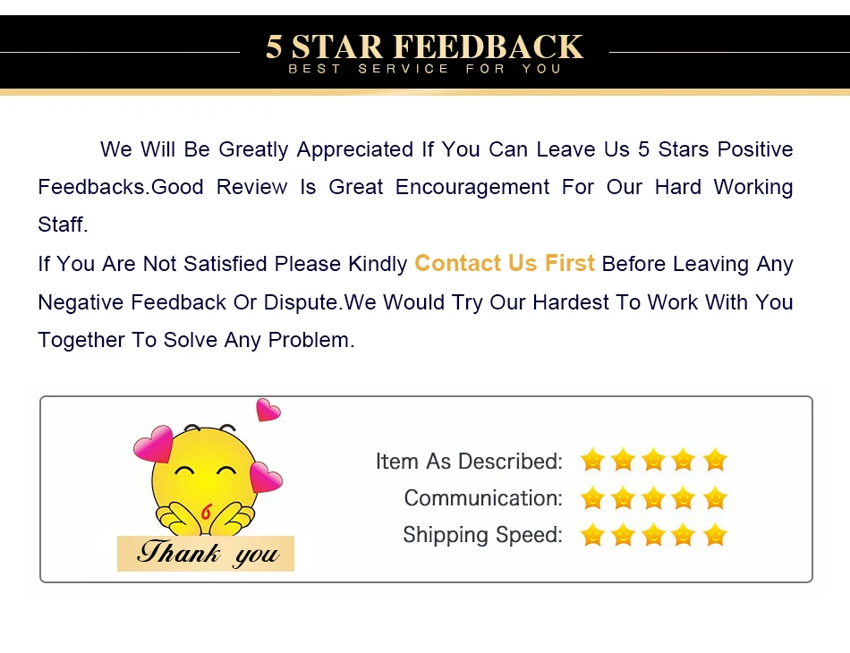 Это отличная оценка, если вы дадите 5 звезд отзывы с фотографиями. Ваша поддержка-отличная помощь и поддержка для наших трудолюбивых сотрудников. Если вы не удовлетворены волосами, пожалуйста, свяжитесь с нами, прежде чем оставлять отрицательный отзывы. Мы решим любые проблемы для наших клиентов.