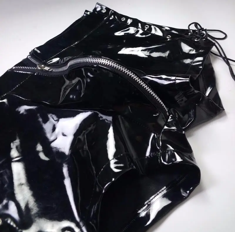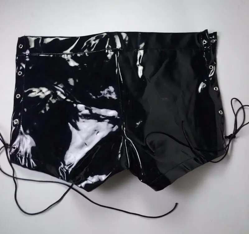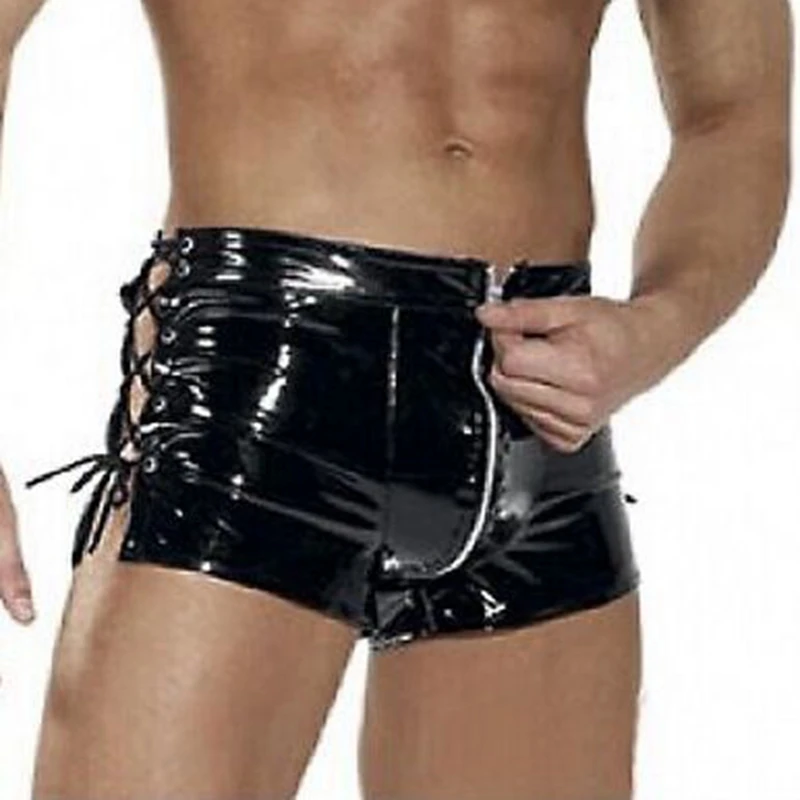 Размера плюс сексуальные боксеры для мужчин открытый промежность искусственная кожа белье сценический шнурок ПВХ черные лакированные кожаные Боксеры Шорты Нижнее белье