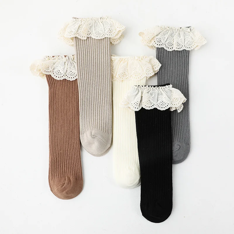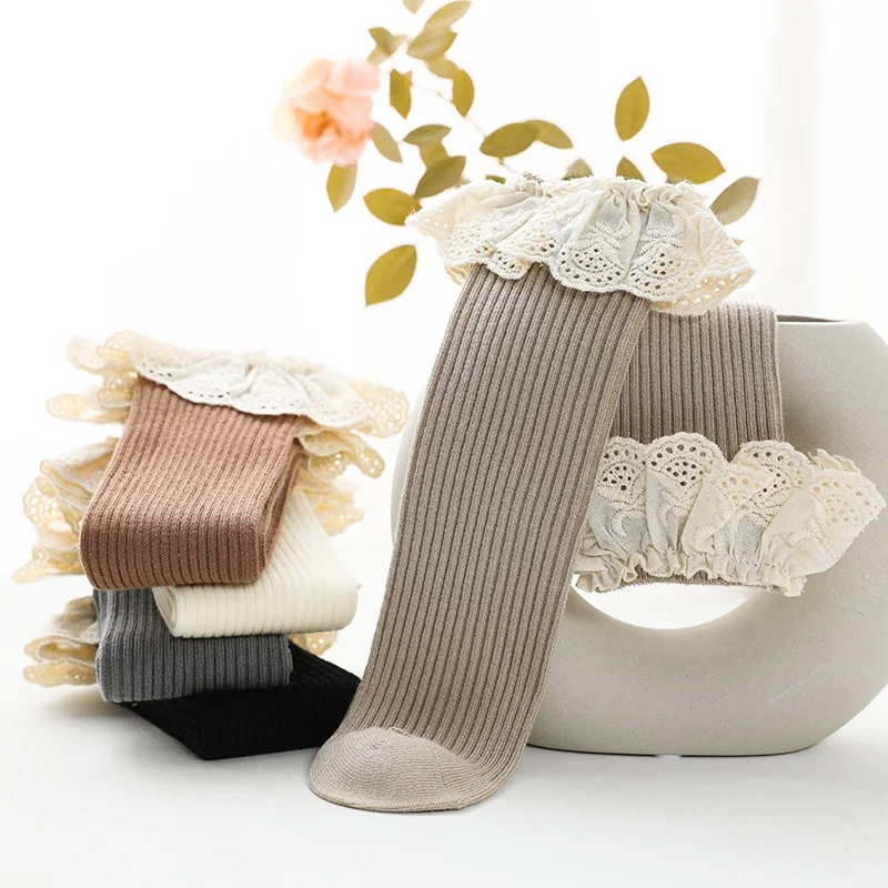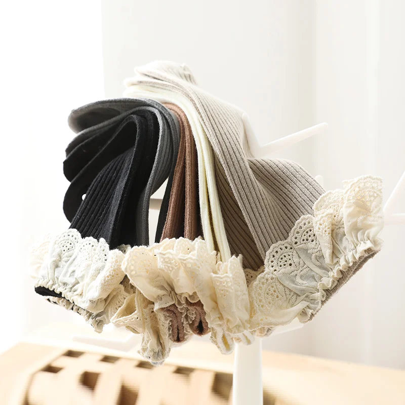 Однотонные вязаные носки для новорожденных девочек с оборками и кружевом, милые чулки-трубки для весны, осени, зимы, аксессуары