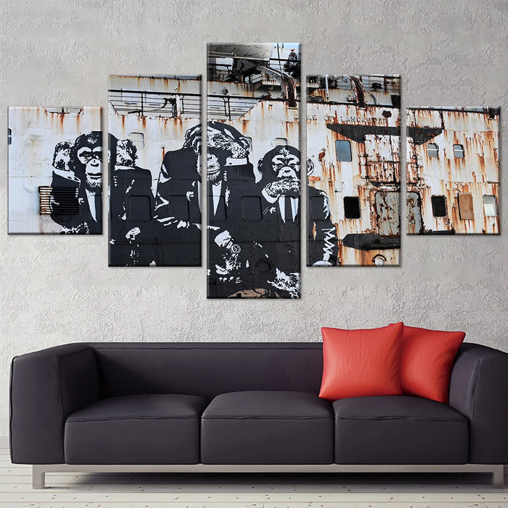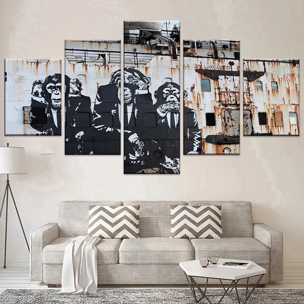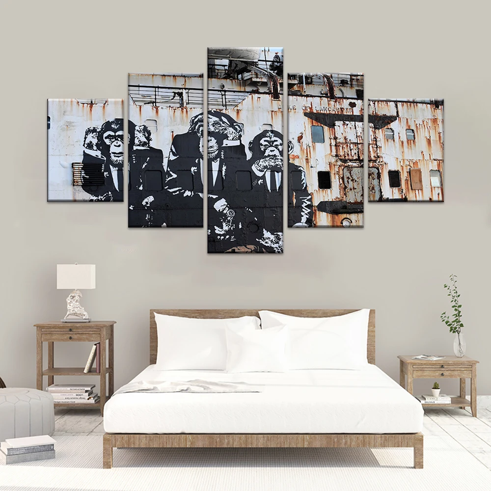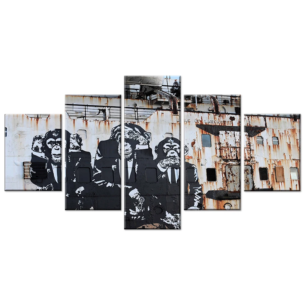 5-панельная домашняя Картина на холсте Decore с 3 обезьянами, граффити Бэнкси, картины, Настенная картина, HD печать, модульный плакат, рамка для