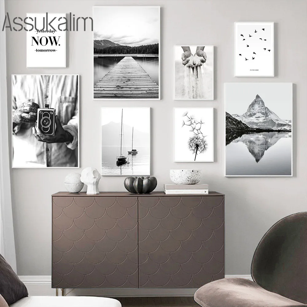 Черно-белый постер, пейзаж гор, озеро, отражение, холст, живопись, ...