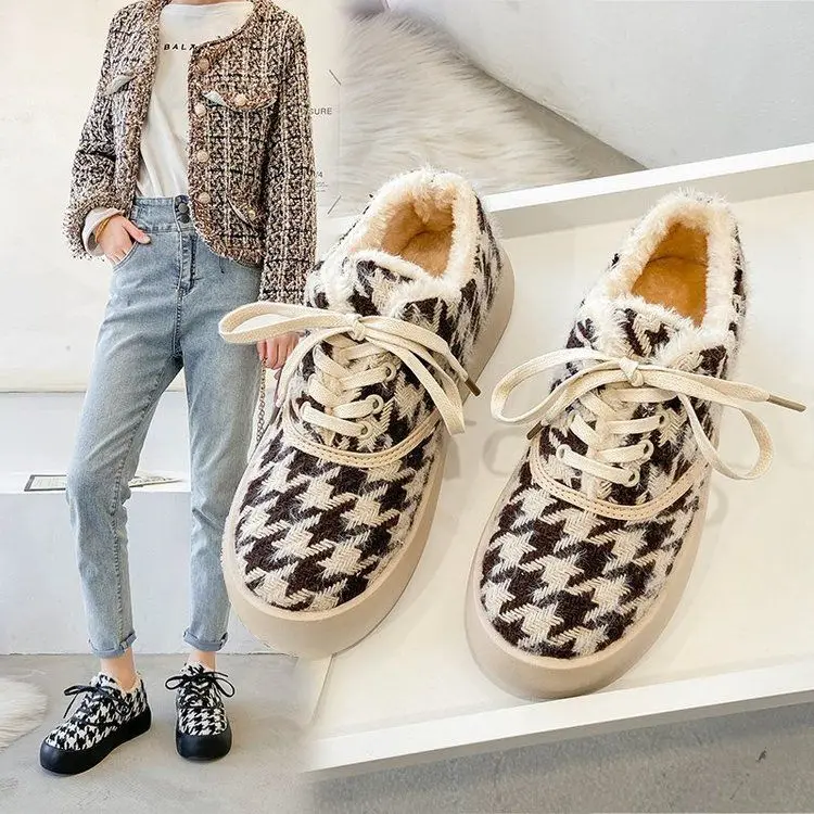 2021 плюшевые туфли на толстой подошве, женские зимние туфли с рисунком гусиные лапки, лоферы для ленивых, обувь с большим носком из хлопка