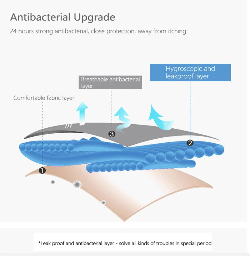 1. Высокое качество 3-х слойные, хорошо впитывают воду и герметичная ткань;2. Очень мягкие и дышащие, заботятся о себе весь день;3. Удлинить и расширить ткань для более эффективной защиты