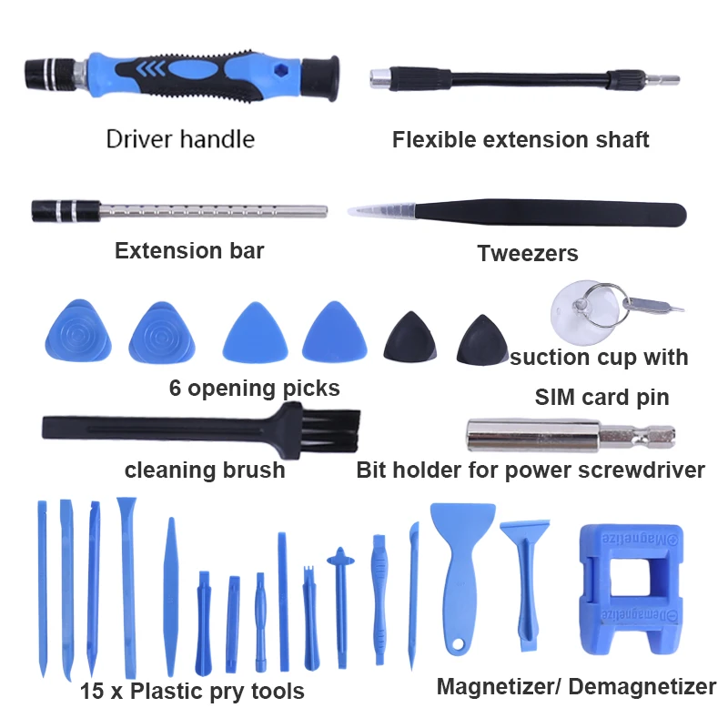 1 x ручка (пластик)1 х гибкий Удлинительный вал1 x удлинитель2 пинцета15 пластиковых инструментов2 x удаление sim-карты1 х намагничиватель/размагничиватель1 x присоска6 отверстий3 x держатель для отвертки1 x ручка y-формы1 х винт памяти мат1 х Салфетка для очисткиЧистящая Щетка-1 шт.1 х Винтовая сумка1 отвертка1 антистатический ремешок на запястье