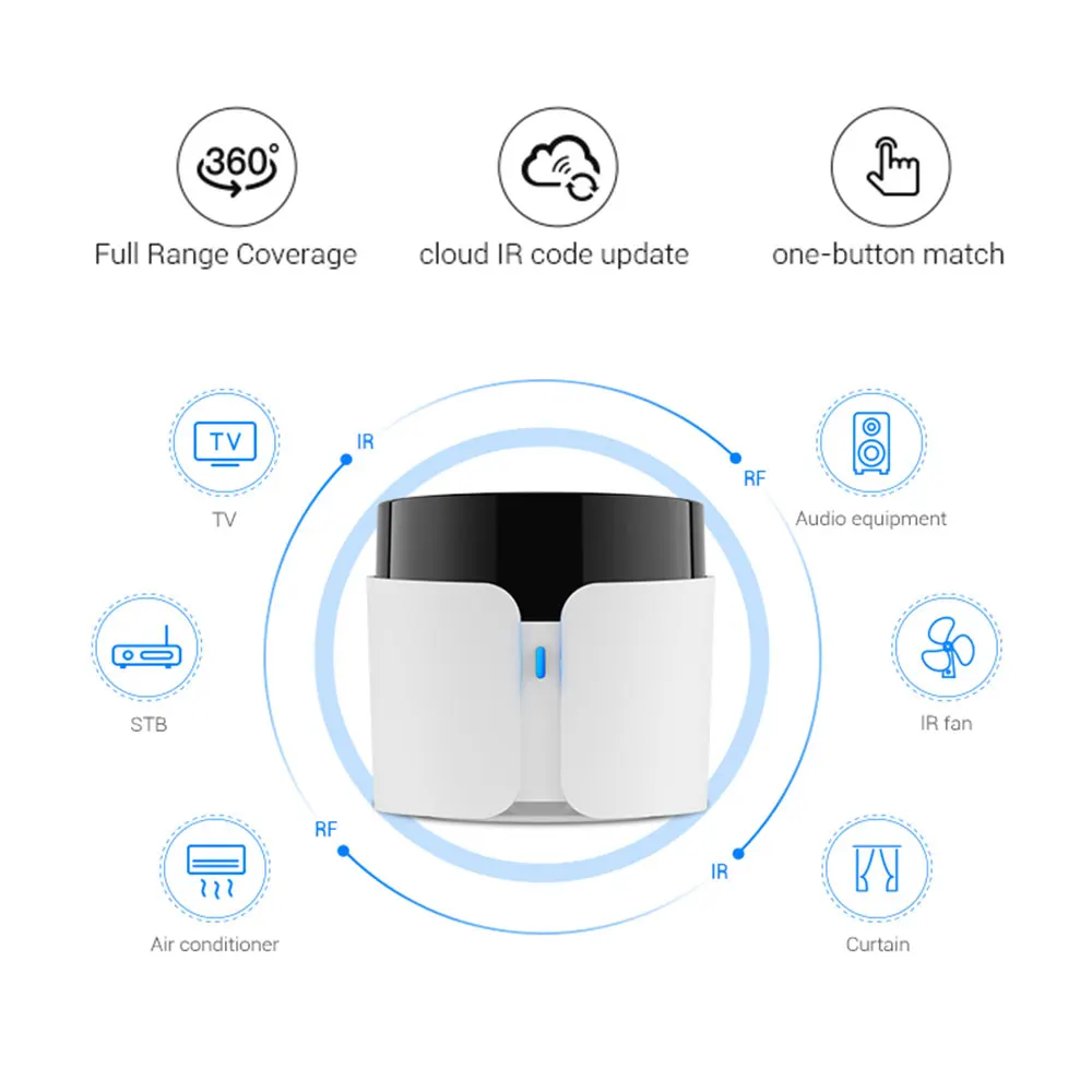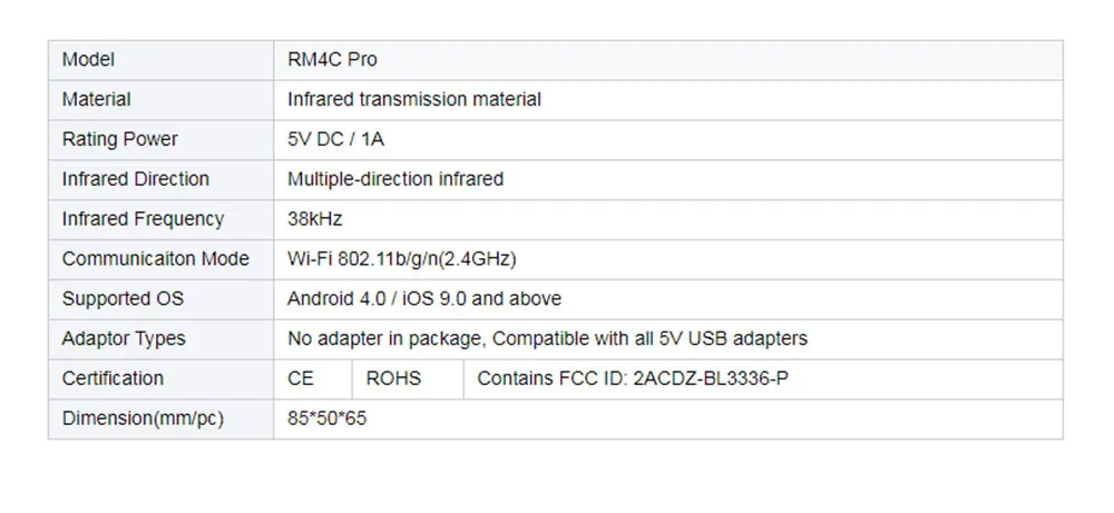 Бренд: BestconНомер модели: RM4C proРежим связи: Wi-Fi 802,11 b/g/n (2,4 ГГц)Влажность при эксплуатации: ≤ 85%Рабочая температура: 0 °C ~ 50 °CПотребляемая мощность: ≤ 1 ВтИсточник питания: 240 ~ В переменного тока, ГцПотребляемая мощность: 5 В постоянного тока ≥ 0,5 А (Micro USB)Входное напряжение: 5 В постоянного токаВходной ток: 1 АИнфракрасная частота: 38KИнфракрасное направление: МногонаправленноеДиапазон инфракрасного управления: ≤ 8 м (стандартный)Индикатор работы: 1 x светодиодныйРадиочастотный диапазон управления: 50 м (прямая видимость)Частота RF: 433 МГц, 315 МГцСертификация: CE, RoHSРазмеры (мм/шт):85*50*65Вес (г/шт):95