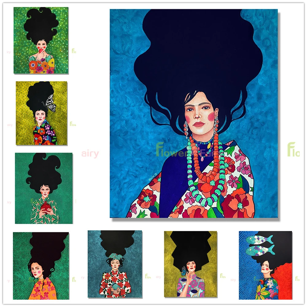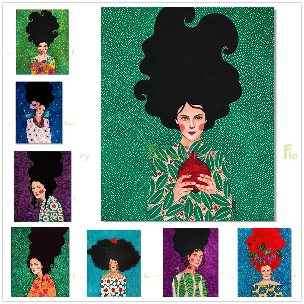 Абстрактная девушка волосы цветок птица стена искусство холст живоп...
