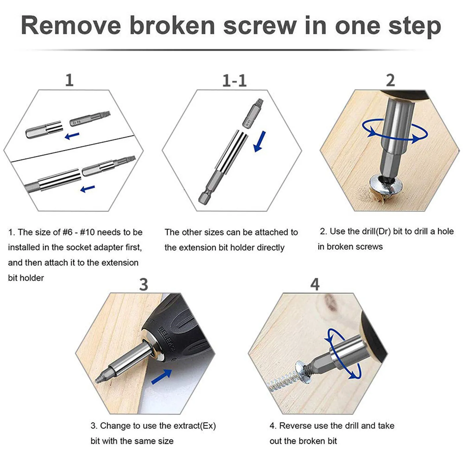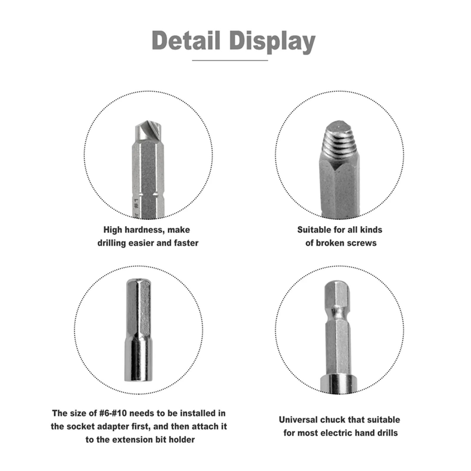 Особенности:1. Используйте сверло обратного хода. Винтовой экстрактор использует обратный принцип для более легкого удаления сломанных бит, включая 10 сверл (Dr #1-#10), 10 экстракторов (Ex #1-#10), 1 шт. держателя удлинителя и 1 шт. адаптера гнезда. Они могут работать с инструментами для сверления и винта общих размеров или ручки отвертки.2. Широкое использование. 22 шт. различных винтовых экстракторов, идеально подходит для снятия, поломки, застревания или повреждения и удаления винтов; Легко извлекать встроенные, ржавые и окрашенные винты и болты. Этот инструмент работает на шестигранных болтах, машинных винтах, болтах лага, деревянных винтах, шестигранных болтах, винтах из листового металла, закругленных болтах, чтобы назвать несколько.3. Прост в использовании. Просто выберите меньший экстрактор, чем поврежденный винт, а затем вставьте в сверло-флип-инструмент-экстракт. Пожалуйста, используйте их на электрической ручной дрели, а не на молотковой дрели.4. Портативный. Набор для удаления винтов поставляется с набором необходимых инструментов, очень удобно положить его в сумку или взять в любом месте. Вы можете легко удалить любой зачищенный винт за 10 секунд или меньше.Примечание:1. Рекомендуется использовать электрическую ручную дрель вместо молотковой дрели.2. Необходимо сначала сверлить отверстие, когда поврежденная поверхность винта гладкая. В противном случае Сверло будет скользить.3. При зачистке поврежденного винта необходимо использовать его вертикально в обратном направлении и низкой скорости (RPM≤ 200) на протяжении всего процесса. Или вы получите боль.ПараметрыРазмер: 22 шт.Материал: HSSВес: 170 гПосылка включает в себя:1 x адаптер гнезда: 26 мм x 4 мм1 x магнитным держателем бит расширения: 60 мм x 6,35 мм20 х поврежденных винтовых экстракторов (Ex #1 - #10, Dr #1 - #10)1 x коробка