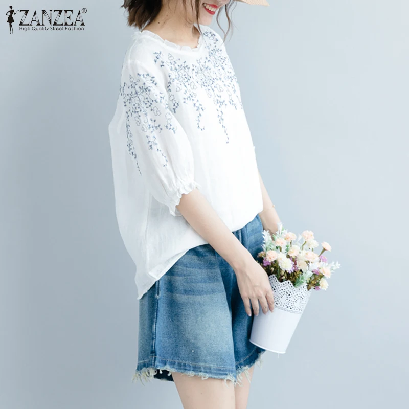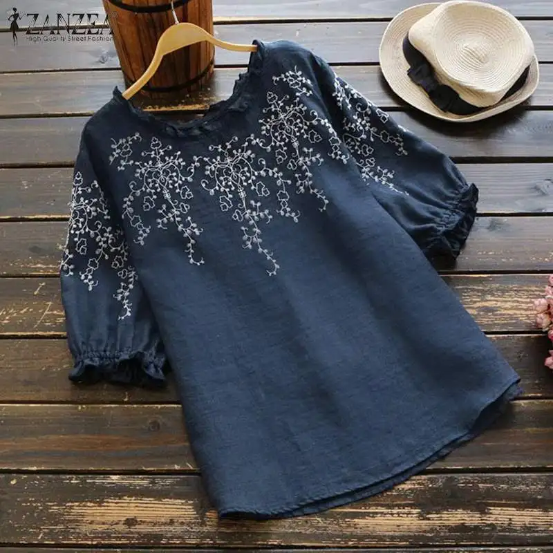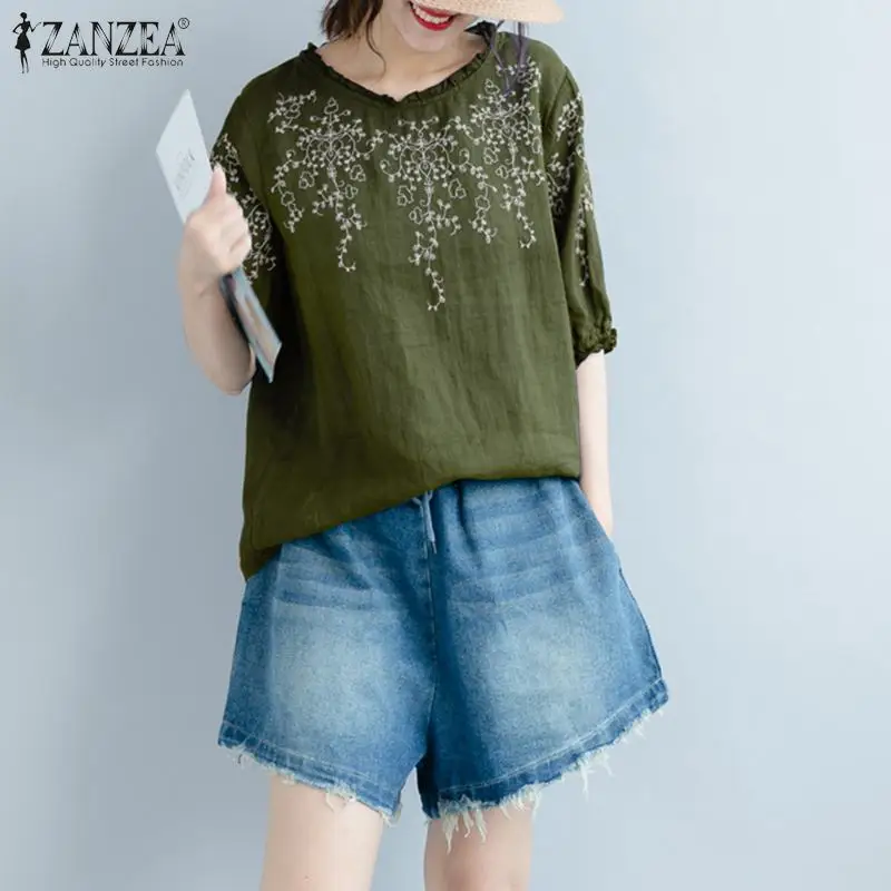 Блузка ZANZEA женская с вышивкой, повседневный кафтан с рукавом до локтя, рубашка с круглым вырезом, Блузы туники, лето 2021