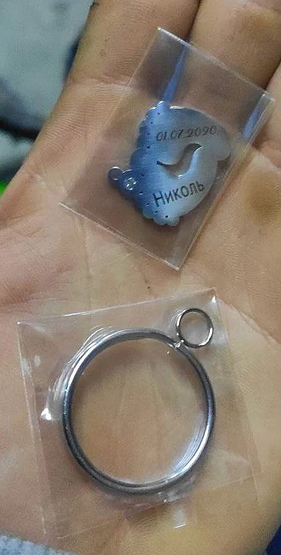 Брелок с гравировкой. Брелок выполнен из нержавейки. Поверхность гладкая и блестящая. Доставка очень быстрая. Поразила упаковка: брелок был в разобранном виде и каждая деталька в индивидуальном пакетике. Гравировка. Продавец на сообщения отвечает сразу,что очень радует. Я написала свои пожелания и продавец их выгравировал. Отличный магазин, ответственный продавец!!! Мои наилучшие рекомендации!!!!